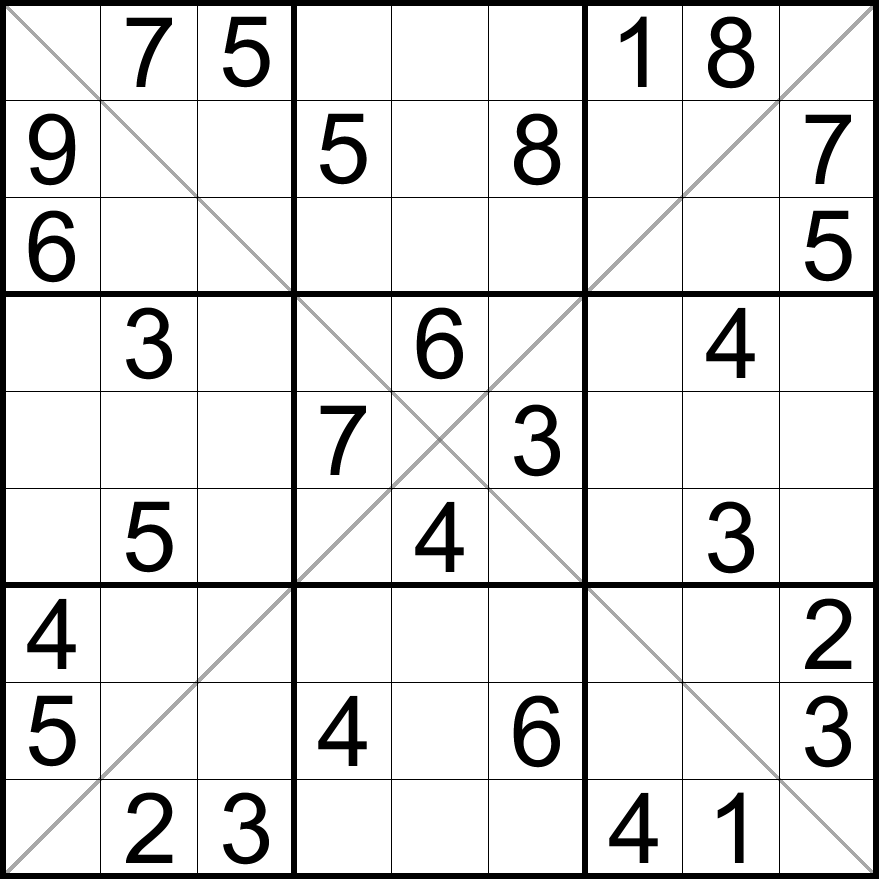 对角线数独:将数字1-9填入空格内,使每行、每列、每宫和两条对角线上的数字均不重复。