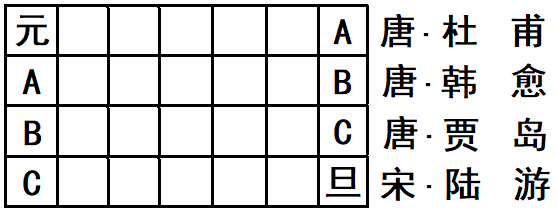 元旦即将来临,请在下图中从左上角的“元”字开始,到右下角的“旦”字结束,在空格中填入恰当的字,组成四句首尾相接的古诗句。