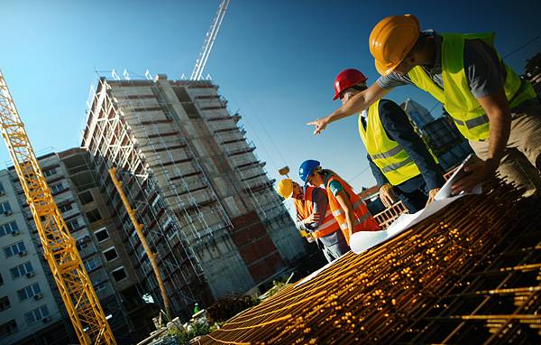 有两三个戴安全帽的工人正站在楼前落满阳光的空地上,指挥人们安全通行。阳光灼热,照耀着他们头上的安全帽及黝黑的脸庞。