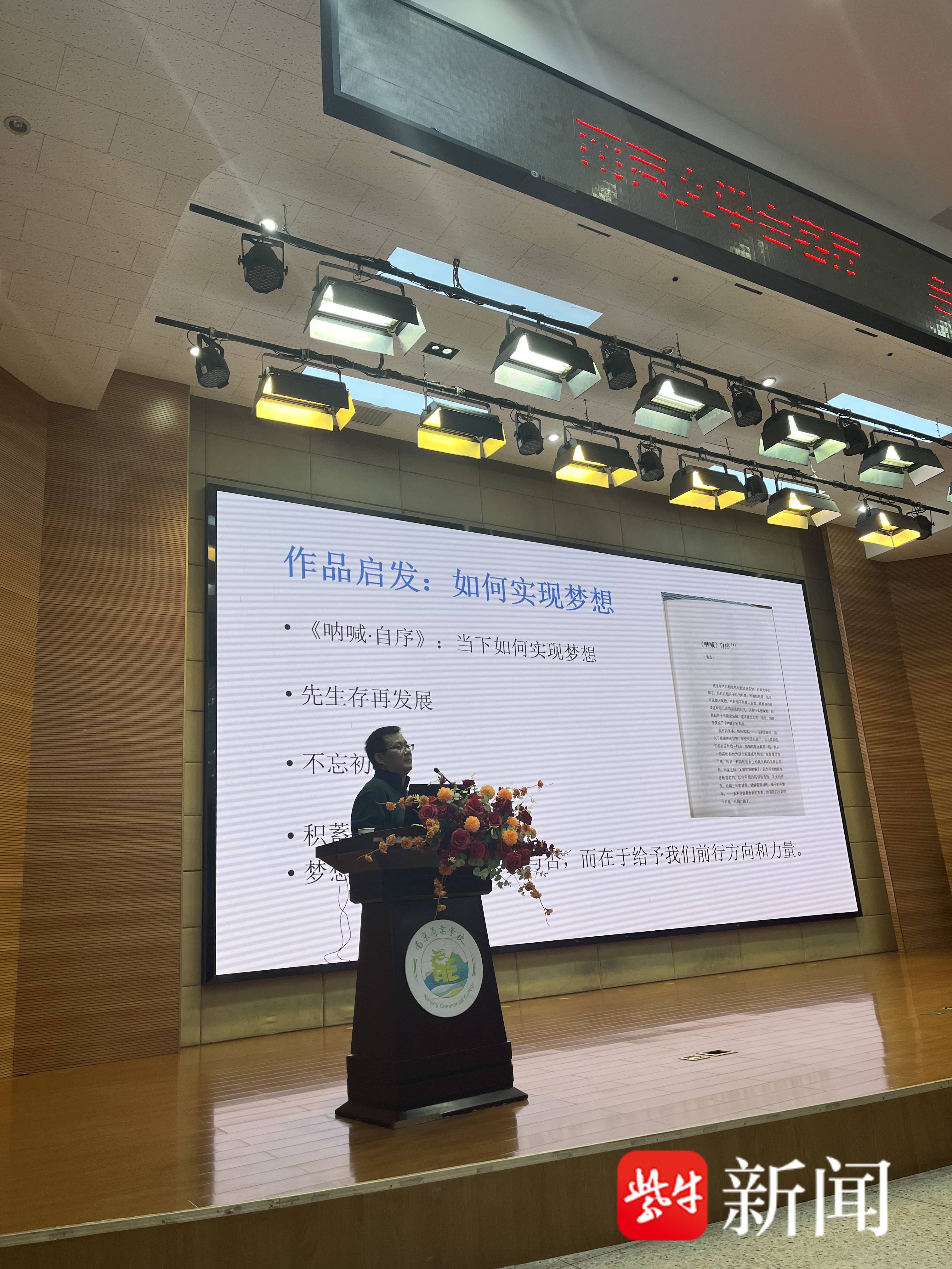 当鲁迅的犀利目光遇见AI时代的迷茫青年,会碰撞出怎样的思想火花?11月24日下午,南京商业学校大礼堂座无虚席,“南商文学会客厅”第二讲《鲁迅作品与AI时代的年轻人》在此开讲。主讲人、被誉为年轻人中研究弘扬鲁迅“第一人”的张守涛老师,为师生们带来了一场穿越时空的思想对话。