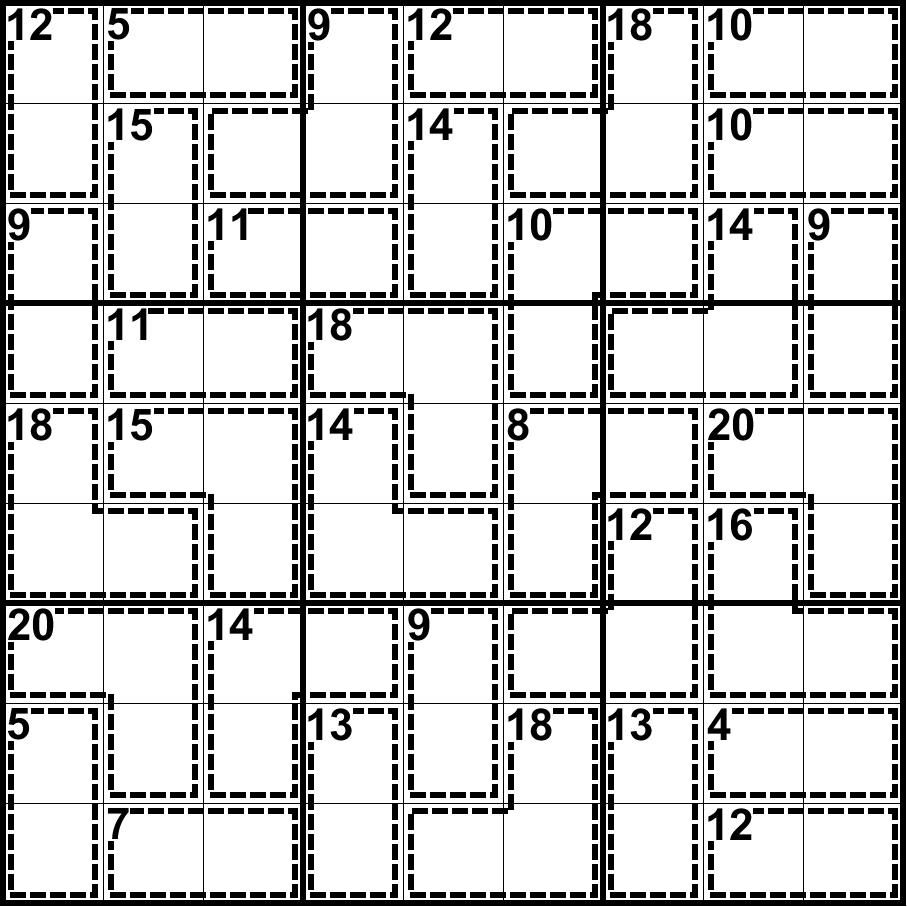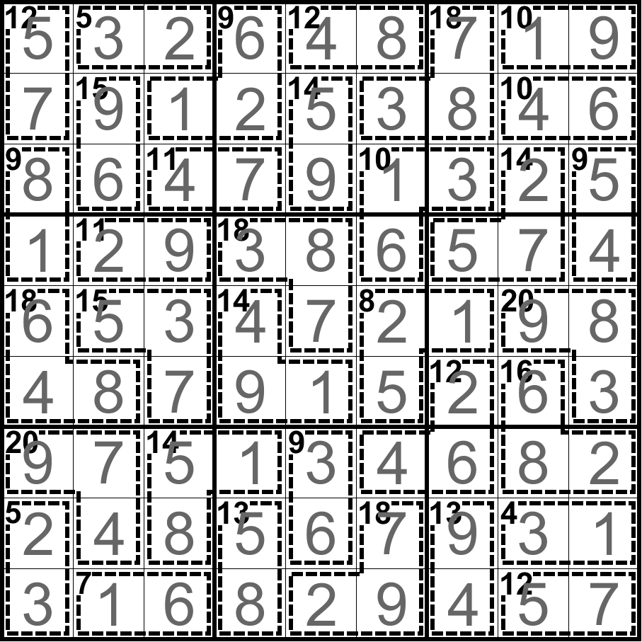 杀手数独:将数字1-9填入空格内,使每行、每列和每宫内的数字均不重复。虚线框内提示数表示框内所有数字之和, 同虚线框内不能填入相同的数字。
