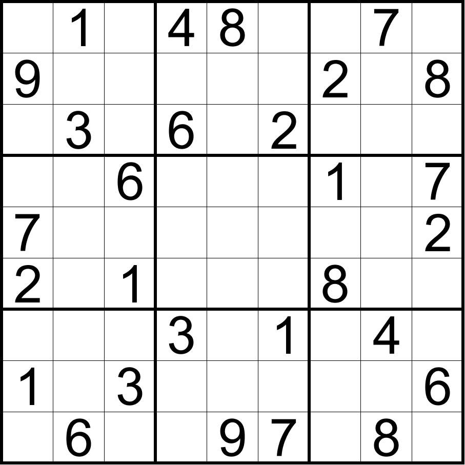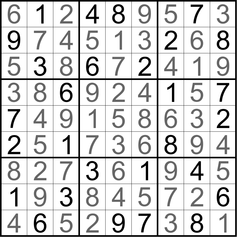 无马数独:将数字1-9填入空格内,使每行、每列和每宫内的数字均不重复。彼此形成国际象棋中马步(二格拐一格)位置的两格内不能填入相同的数字。