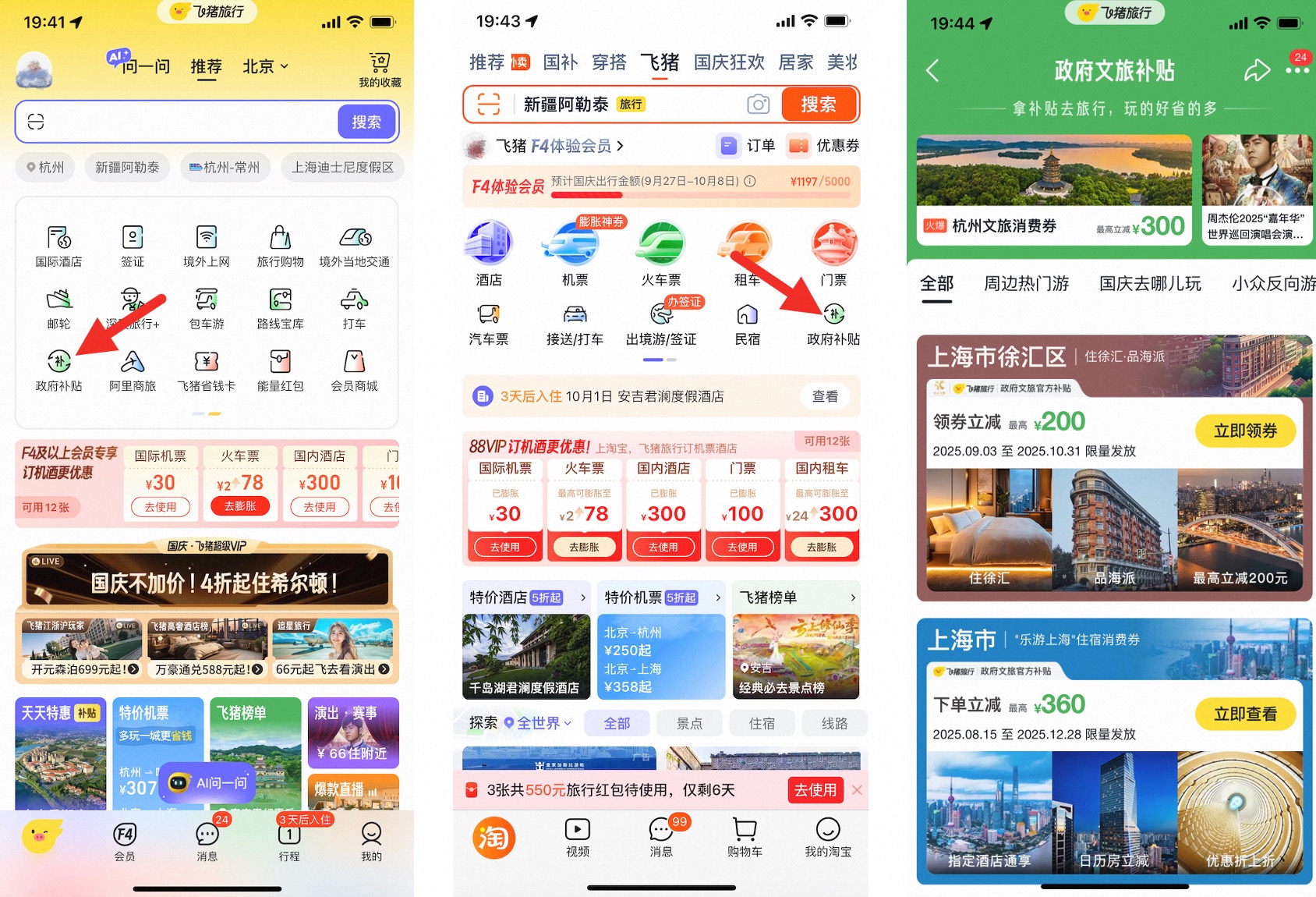 扬子晚报网讯(记者 徐晓风)黄金周出游,这里可以领50地文旅补贴!9月29日,飞猪的“政府补贴”专属入口正式上线。消费者通过飞猪App、淘宝App飞猪频道,或在飞猪App搜索“政府补贴”,即可直接进入专区,集中浏览全国超50地文旅消费券发放情况,预订相关旅游服务。从这个“十一”开始,消费者获取各大目的地官方发放的文旅消费补贴更方便了。