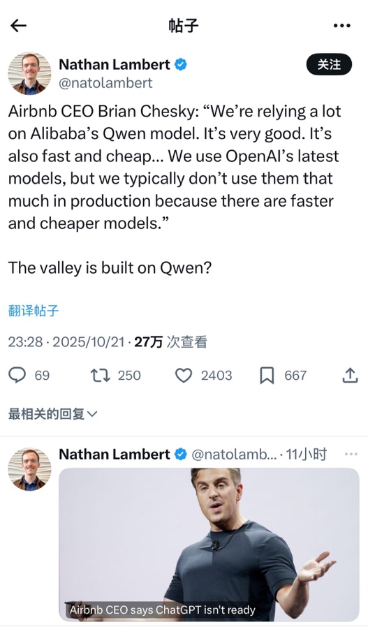 10月22日,爱彼迎Airbnb CEO布莱恩·切斯基在媒体采访中公开表示,公司正“大量依赖阿里巴巴的通义千问模型”,并直言“比OpenAI更好更便宜”。他同时表示,“我们也会使用OpenAI的最新模型,但通常不会在生产环境中大量使用,因为有更快、更便宜的模型可供选择。”