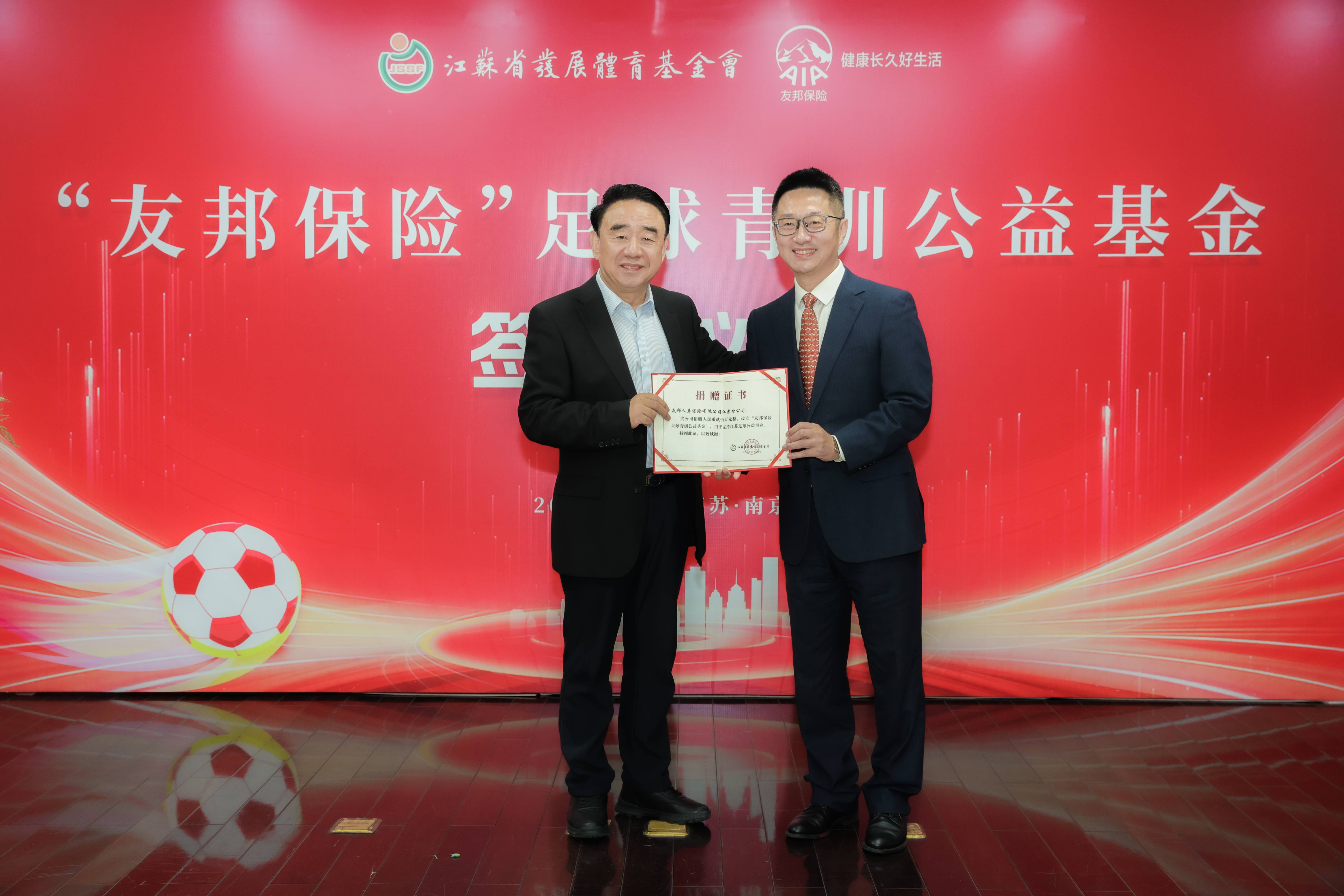 2025年10月22日,江苏省发展体育基金会联合友邦人寿保险有限公司江苏分公司,正式设立江苏省发展体育基金会“友邦保险足球青训公益基金”。江苏省发展体育基金会理事长陈震宁,江苏省体育局副局长张海涛,友邦人寿副总经理兼首席客户官、首席健康业务官张敏,友邦人寿江苏分公司总经理杨东强等领导和嘉宾以及江苏足球青训球员代表出席签约活动。