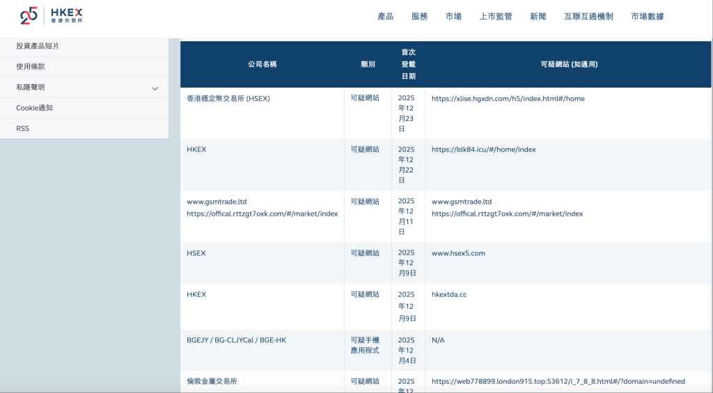 据澎湃新闻统计,香港交易所公布的可疑网站超过400个,其中有的假冒网页目前仍在活跃。例如,一个名为“香港稳定币交易所 (HSEX)”的假冒网页至今仍可访问,其页面设计与正规交易平台高度相似,显示加密货币、虚拟货币涨跌幅行情,并且有充币、提币等功能。