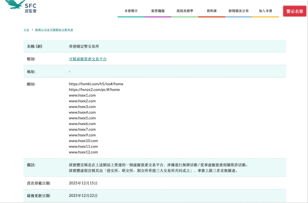 值得注意的是,早前12月15日,香港证监会也把“香港稳定币交易所”列入了“可疑虚拟资产交易平台”,并把相关网址罗列了出来。香港证监会表示,该实体宣称是在上述网站上营运的一个虚拟资产交易平台,涉嫌进行无牌活动/从事虚拟资产相关欺诈活动。该实体虚假宣称其由“港交所、联交所、期交所香港三大交易所共同成立”,事实上跟三者并无关联。