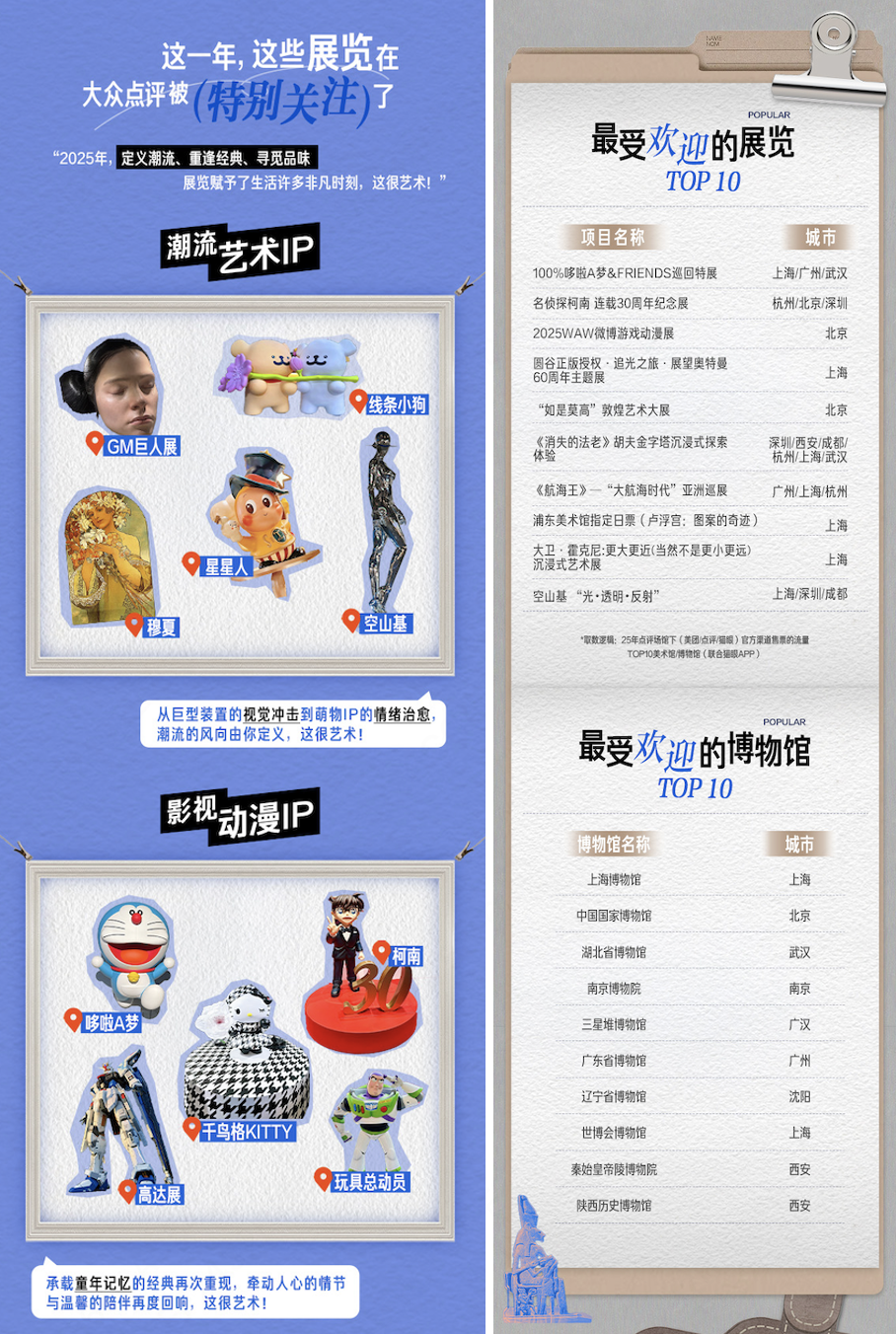 无论是巨型装置的视觉冲击、唤起童年记忆的经典重现,还是独具匠心的理念与精妙绝伦的工艺........2025年,“IP主题式”展览广受年轻人欢迎,“潮流艺术展”“影视动漫展”“时尚品牌展”成为最受欢迎的主题类型。《报告》显示,在2025年全国热门展览中,100%哆啦A梦&FRIENDS巡回特展、名侦探柯南连载30周年纪念展等“IP主题式”展览占五成。