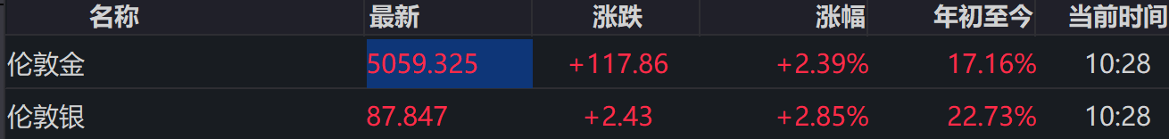 2月4日,现货黄金收复5000美元/盎司关口。10:28,报5059.325美元/盎司,日内涨幅2.39%。年初至今涨幅17.16%。