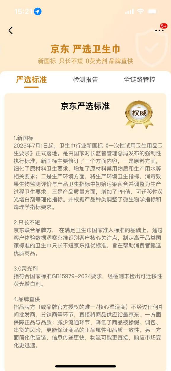 作为日常必需品,什么样的卫生巾更健康更放心?京东超市相关负责人介绍,去年11月推出高于国家标准的“真严选卫生巾”认证以来,已有超过50%的自营卫生巾商品完成“新国标、只长不短、0荧光剂、品牌直供”的商品详情页打标认证。目前,该认证已覆盖高洁丝、护舒宝、苏菲、乐而雅等30余家品牌,通过四项标准、七大举措及百倍赔偿承诺,全面为消费者提供品质保障与安心体验。