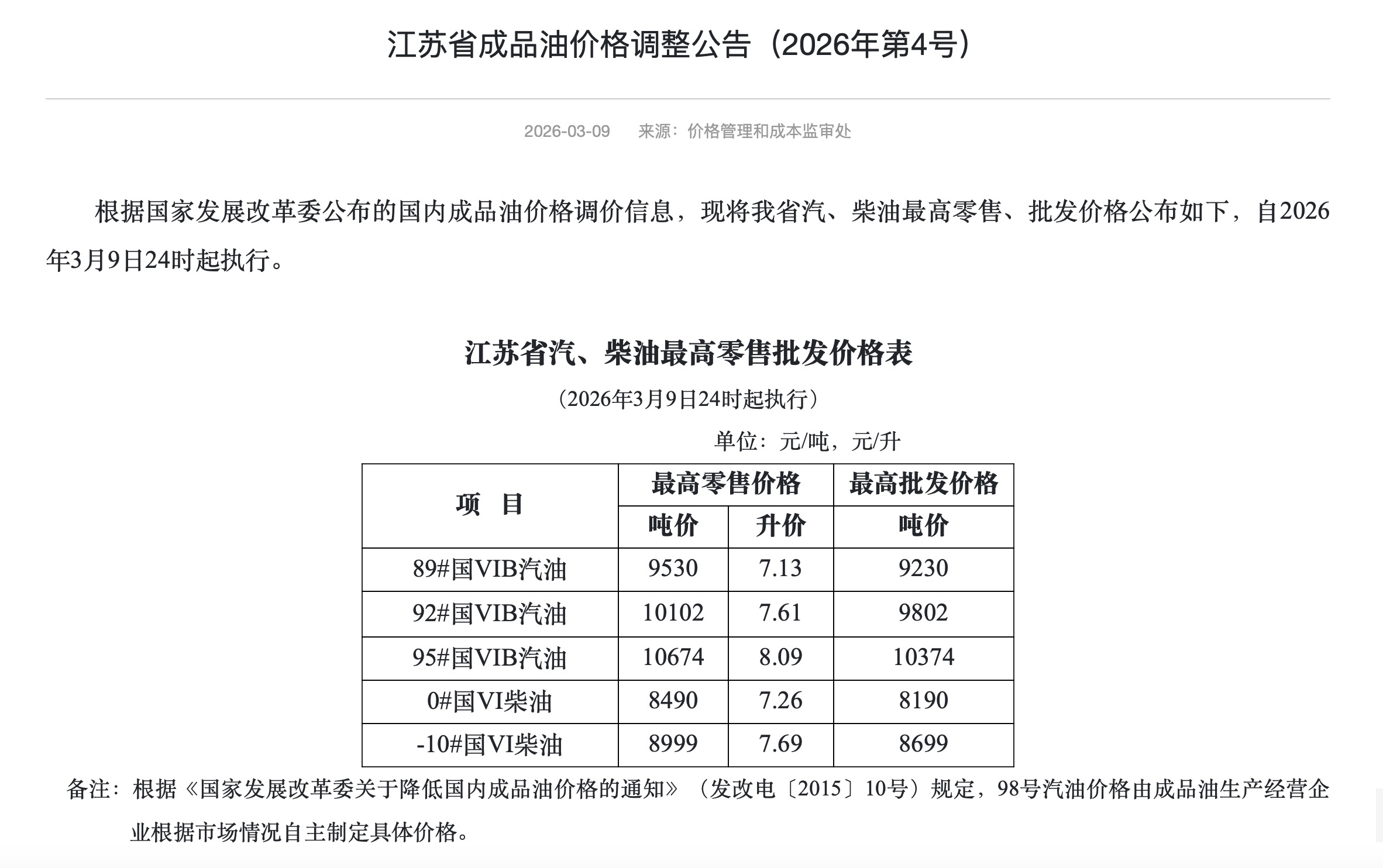 据江苏省发展改革委官方网,调价后92号汽油、95号汽油、0号柴油最高零售价格分别为7.61 元、8.09 元、7.26 元。