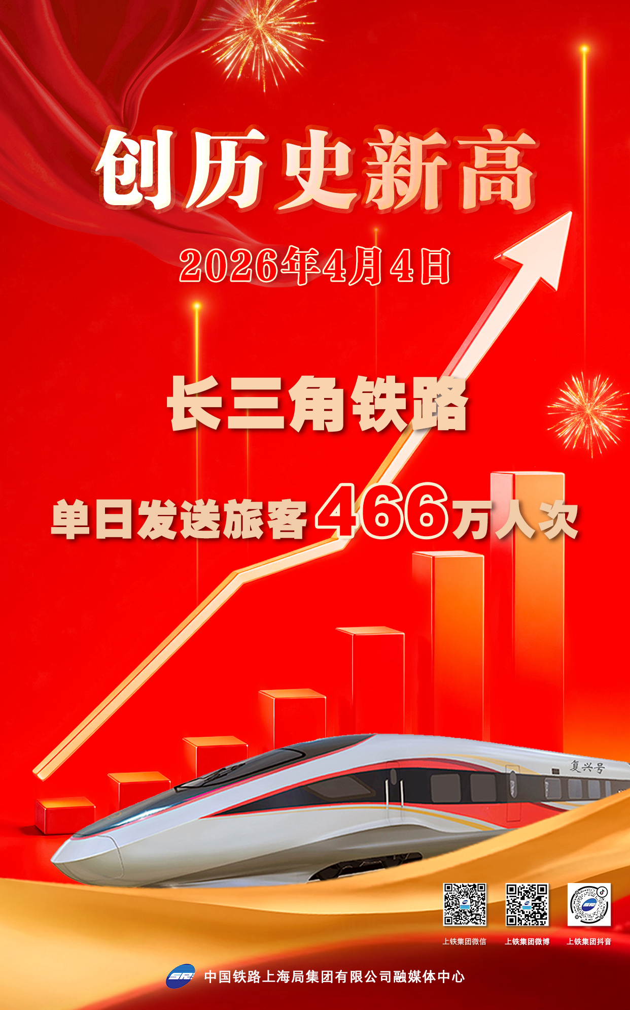 记者从中国铁路上海局集团有限公司获悉,长三角铁路4月4日发送旅客466万人次,超过2025年5月1日单日发送旅客426.8万人次的最高纪录,创单日客发量历史新高。