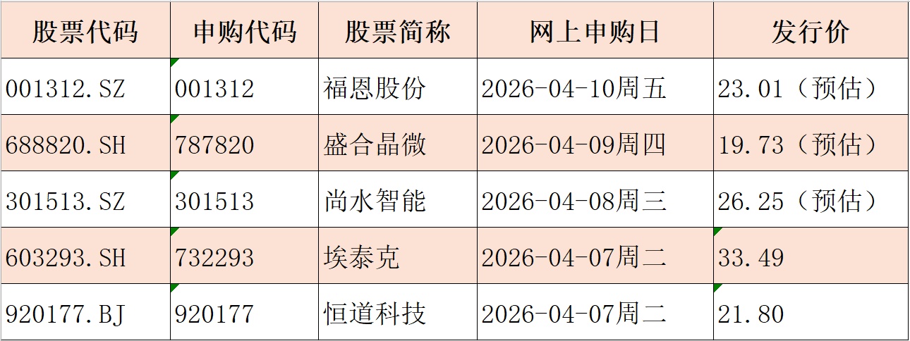 具体来看,4月7日周二发行的是恒道科技、埃泰克;4月8日周三发行的是尚水智能;4月9日周四发行的是盛合晶微;4月10日周五发行的是福恩股份。