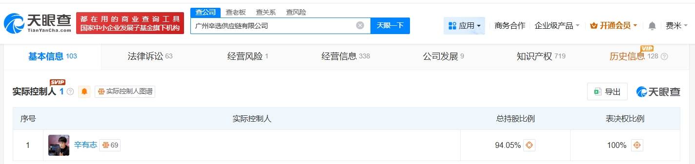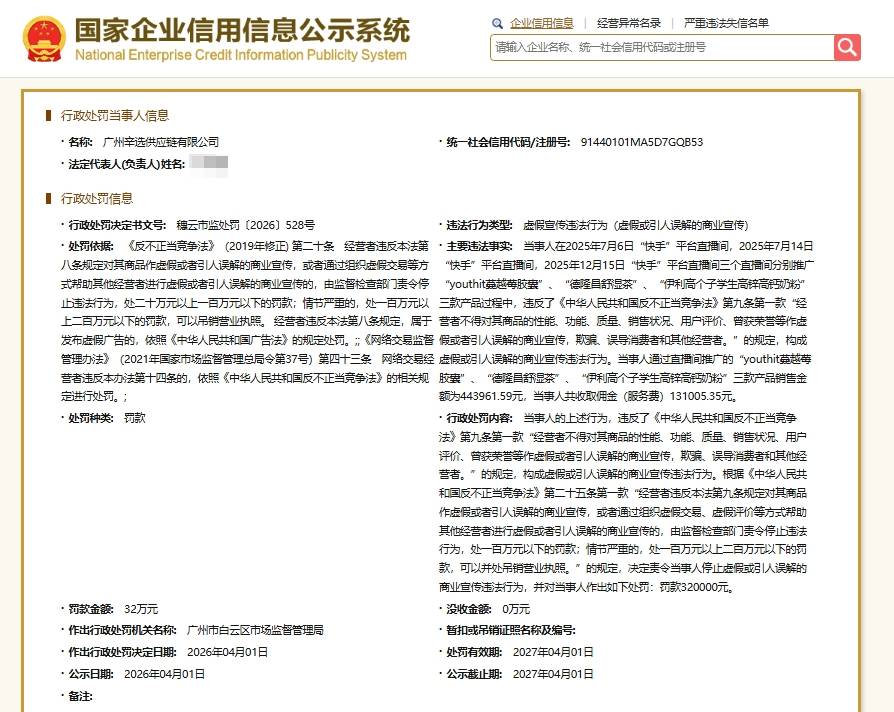 近日,扬子晚报/紫牛新闻记者从天眼查App获悉,广州辛选供应链有限公司因虚假宣传违法行为(虚假或引人误解的商业宣传),被广州市白云区市场监督管理局罚款32万元。该公司成立于2020年4月,由广东辛选控股有限公司全资持股,注册资本1.55亿人民币,经营范围包括服装服饰批发、互联网销售、供应链管理服务等,辛有志(辛巴)为该公司实际控制人。
