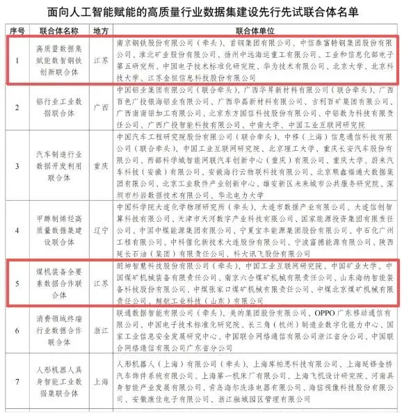 近日,工信部公布面向人工智能赋能的高质量行业数据集建设全国首批先行先试联合体名单,全国有14个单位上榜。其中,江苏省共有2个项目入选,被南京包揽,分别为——南京钢铁有限公司牵头的“高质量数据集赋能数智钢铁创新联合体”、朗坤智慧科技股份公司牵头的“煤机装备全要素数据合作联合体”