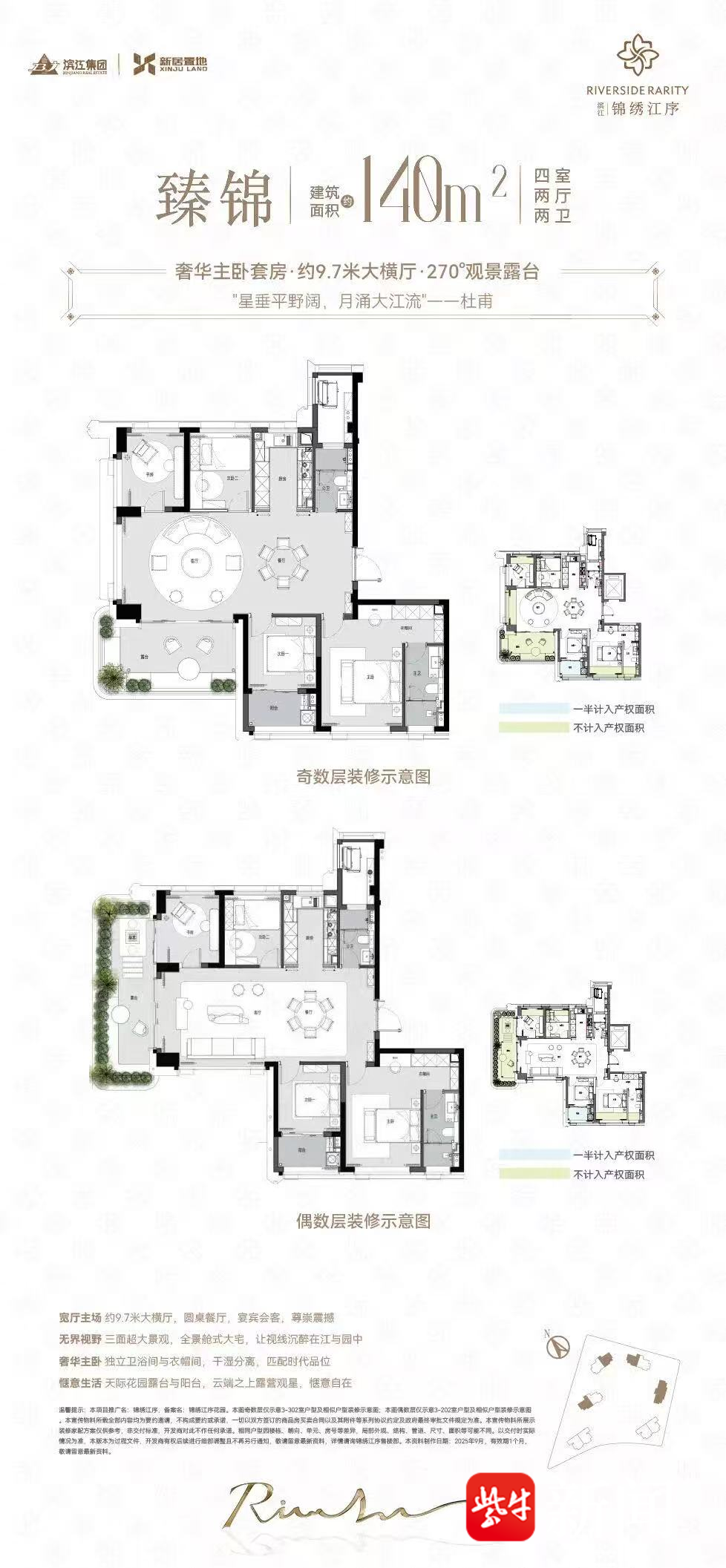 项目主打建面约140㎡-188㎡的纯粹大平层,从起步就确保了圈层的纯粹性。户型设计堪称教科书级别,全系采用端厅设计,配合270°观景露台,将江、园、山景最大化引入室内。