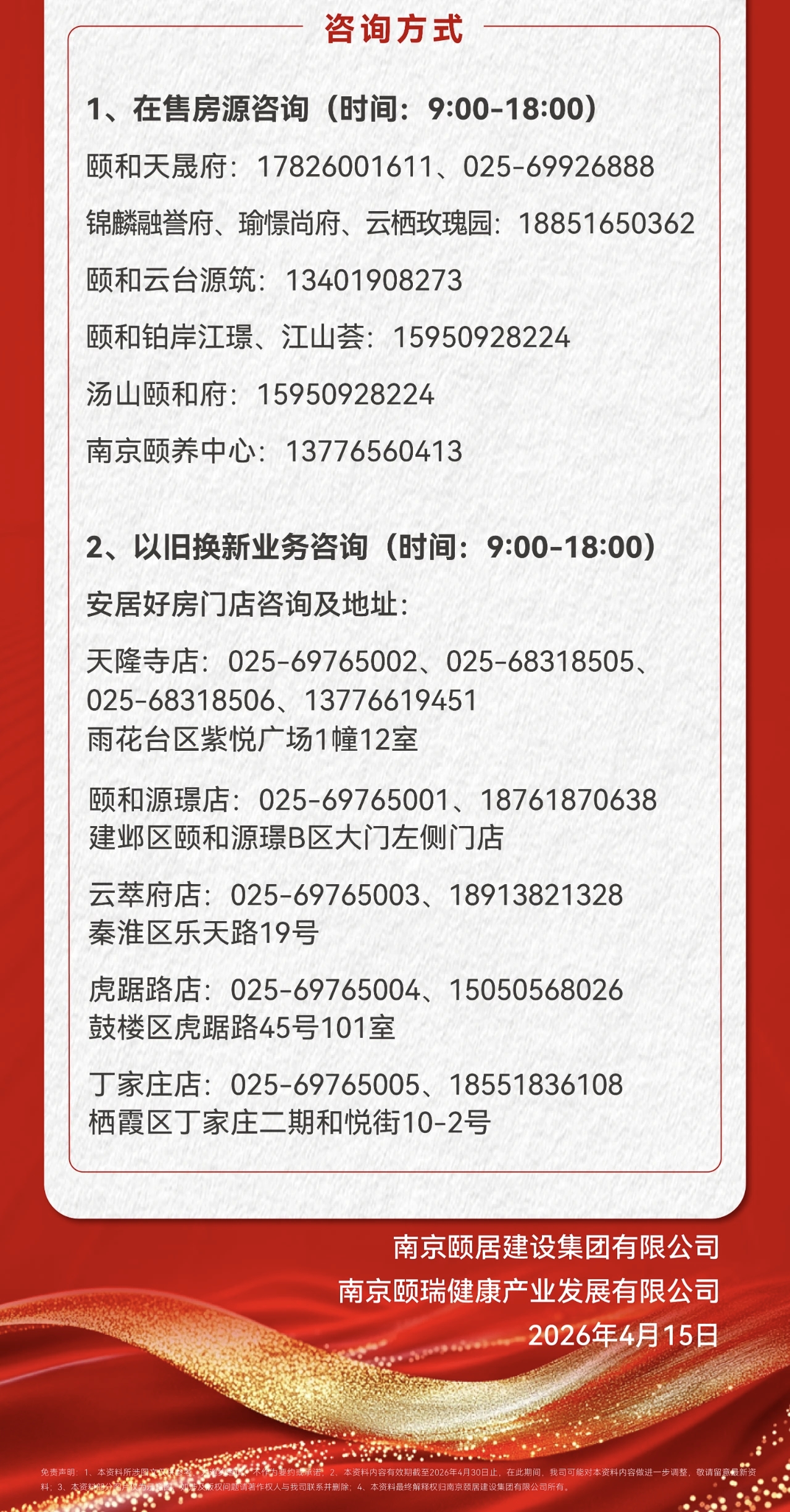 新房房源发布:可微信搜索颐居建设“颐CLUB”小程序,点击“2026年以旧换新活动”专区,查看具体新房房源信息及活动公告。具体在售房源包括颐和天晟府、锦麟融誉府、瑜憬尚府、云栖玫瑰园、颐和铂岸江璟、江山荟、汤山颐和府、南京颐养中心等。
