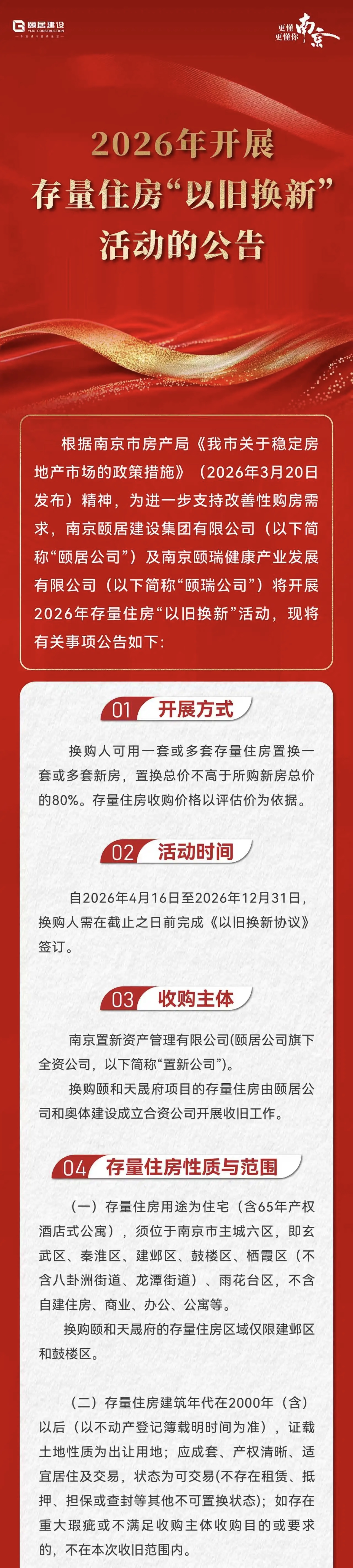 在今年3月20日出台的南京楼市新政“宁六条”中,提出鼓励开展市场化“收旧换新”,并对在年内完成“卖旧买新”的购房人给予贷款总金额1%的贴息。为进一步支持改善型购房需求,安居集团旗下的南京颐居建设公司和南京颐瑞健康产业发展公司联合开展2026年二手房“以旧换新”活动,并正式发布公告: