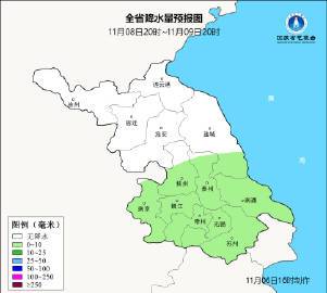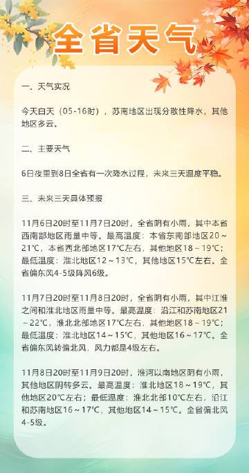 11月6日20时至11月7日20时,全省阴有小雨,其中本省西南部地区雨量中等。最高温度:本省东南部地区20~21℃,本省西北部地区17℃左右,其他地区18~19℃;最低温度:淮北地区12~13℃,其他地区15℃左右。全省偏东风4-5级阵风6级。