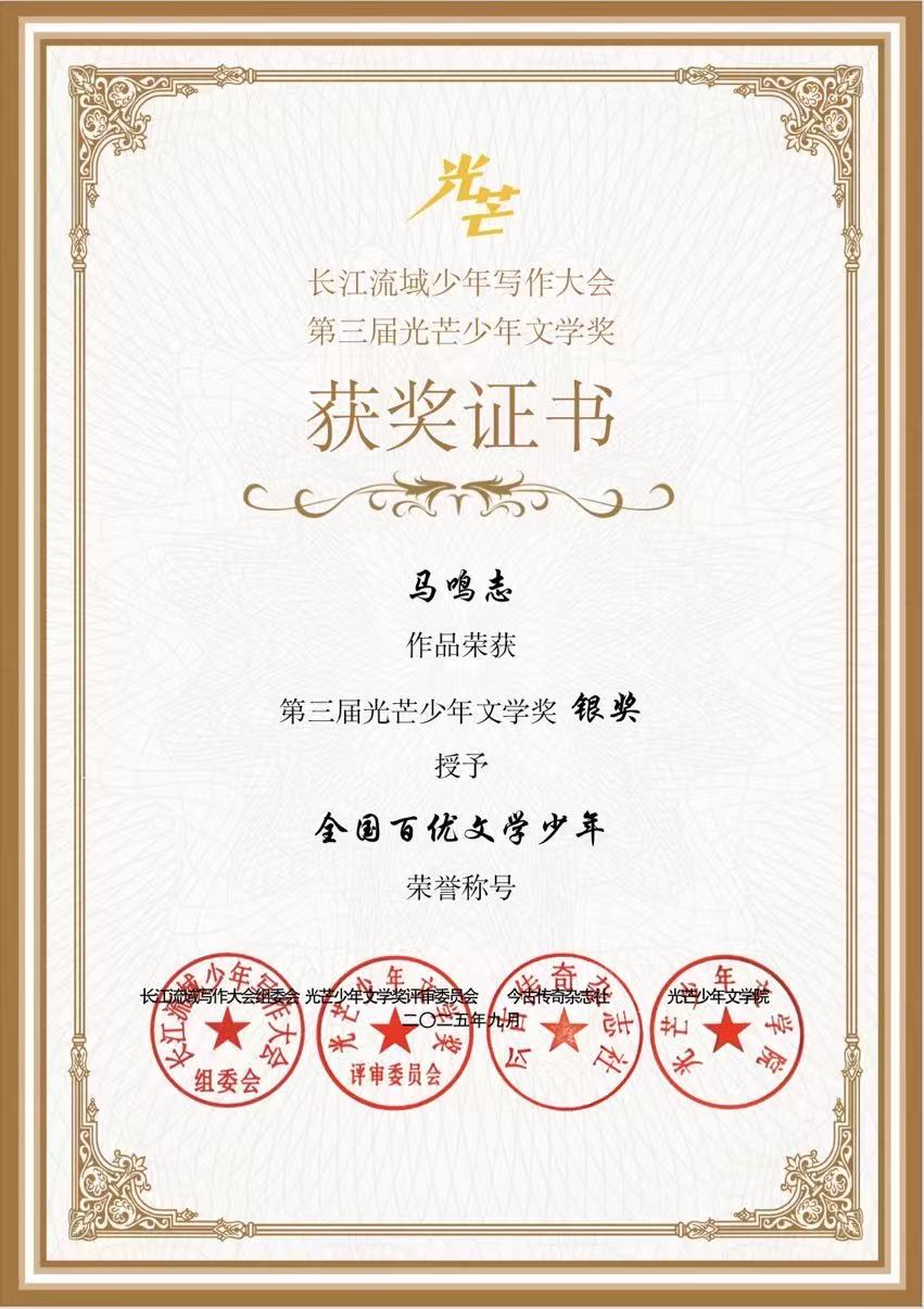 第三届光芒少年文学奖作为长江流域极具影响力的青少年文学赛事,以评审严谨、覆盖面广、含金量高闻名。本次赛事吸引全国青少年文学爱好者踊跃参与,共收到 28951 件参赛作品。年仅 9 岁的马鸣志凭借灵动的诗思与成熟的笔触脱颖而出,其作品中对生活的细腻观察、对世界的独特感悟,赢得评委团一致认可,成功拿下银奖。