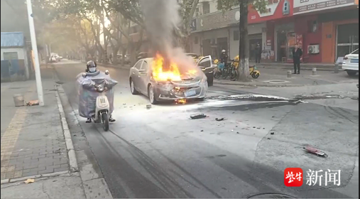 扬子晚报网 11 月 27 日讯(通讯员 张康 记者 朱鼎兆)“前面撞车了!还着火了!”11 月 22 日清晨 7 时 24 分,淮安军营路早高峰的车流中突发惊魂一幕:两辆轿车不慎发生剧烈碰撞,其中一辆轿车前部瞬间燃起熊熊大火,滚滚浓烟迅速裹挟着刺鼻的焦糊味弥漫开来,散落的车辆零件与跳动的火苗交织,现场情况危急万分,随时可能引发二次危险。