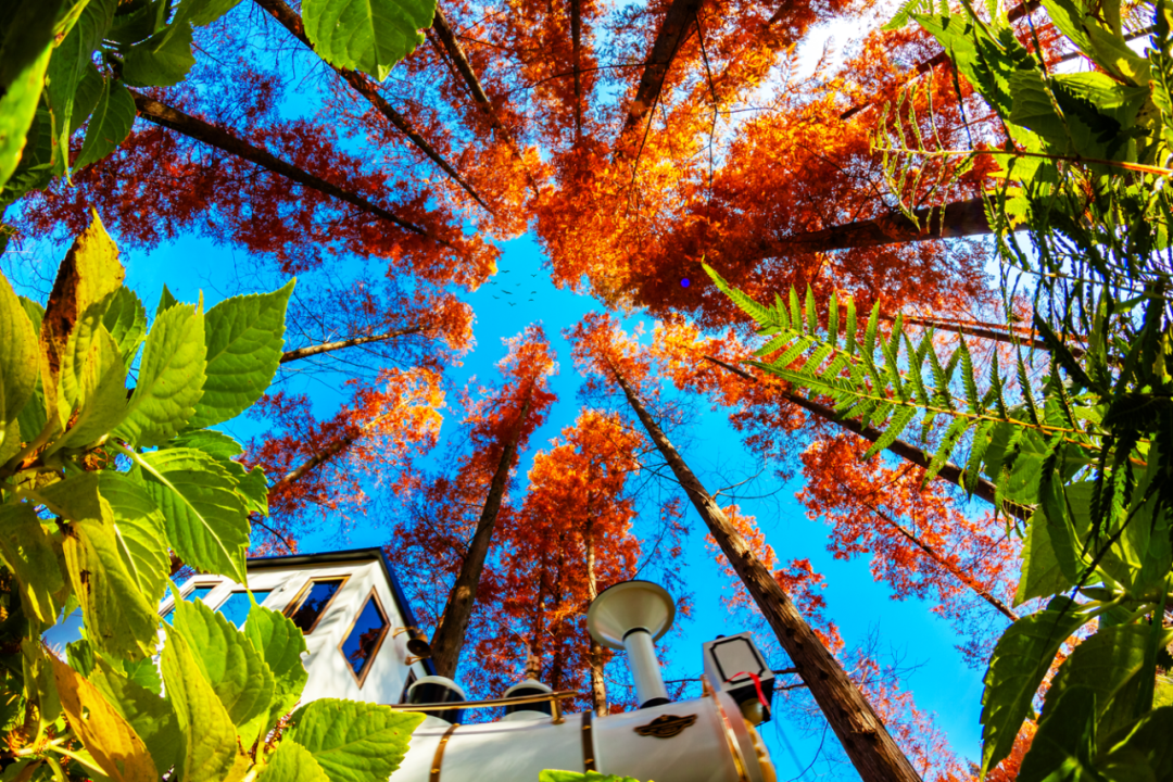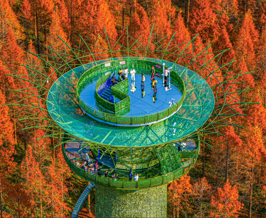 如果登上40米高的“森林之眼”,俯瞰整片林海,更别有一番滋味,层层叠叠,满目红杉。