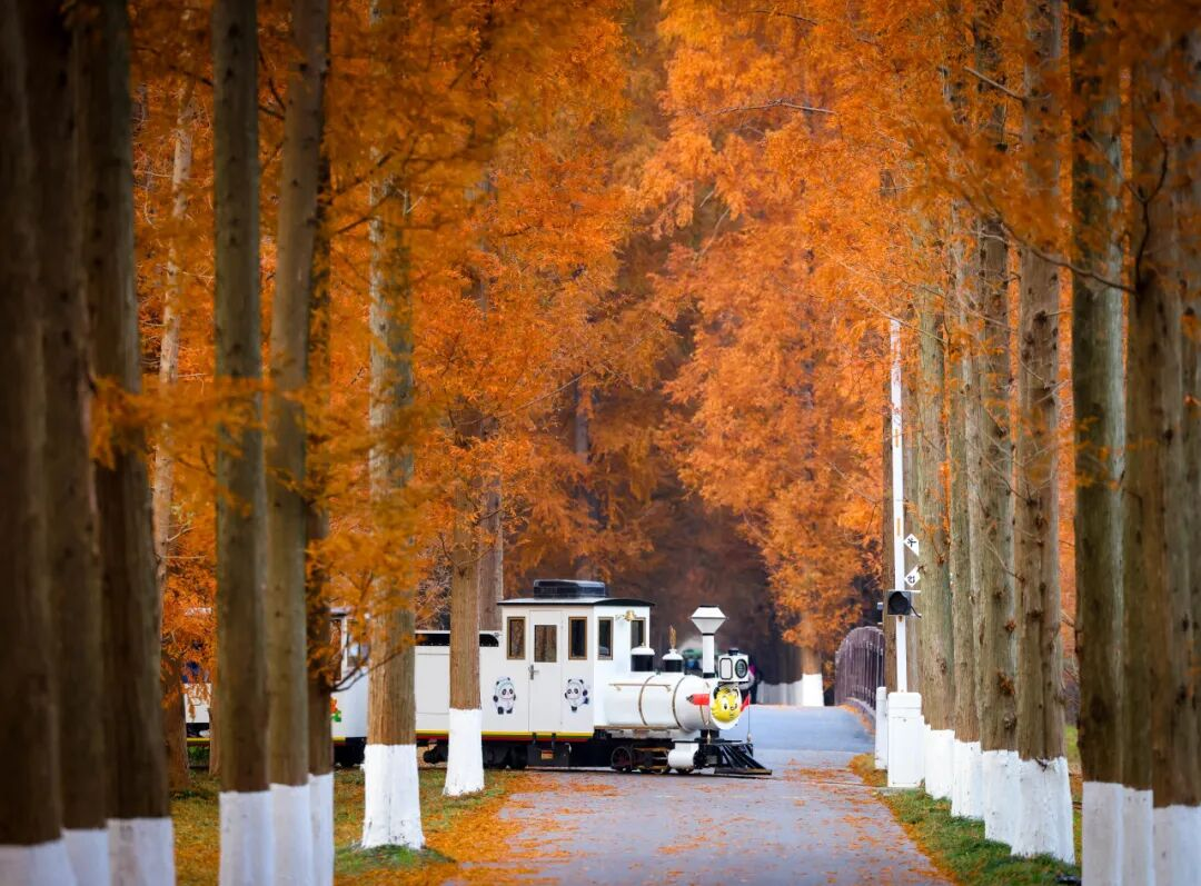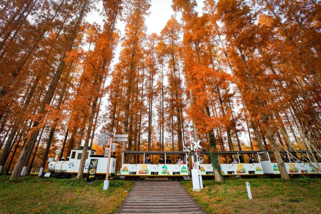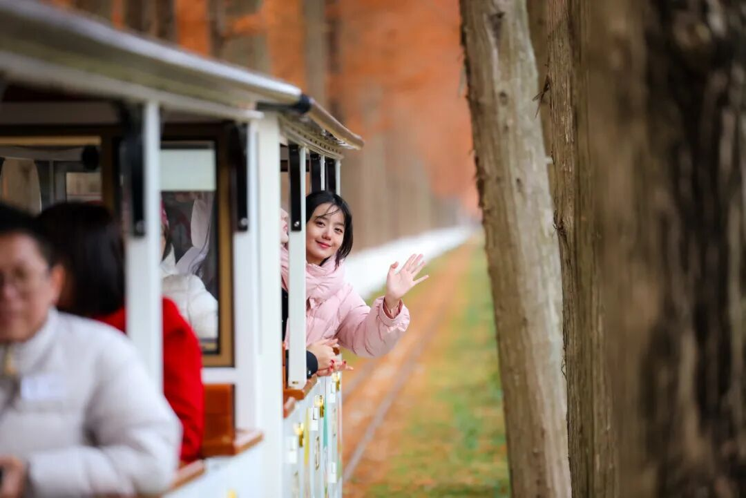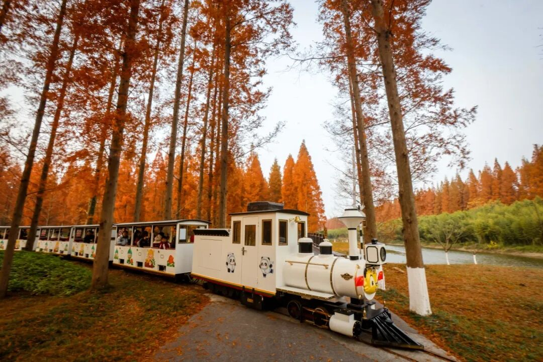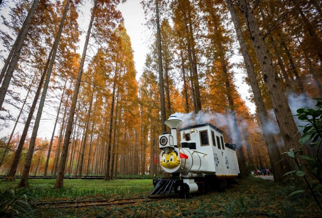 你也可以乘坐小火车,穿梭森林秘境,微凉的风夹杂着自然的清新,带着最温柔的问候:“水杉欢迎你”!