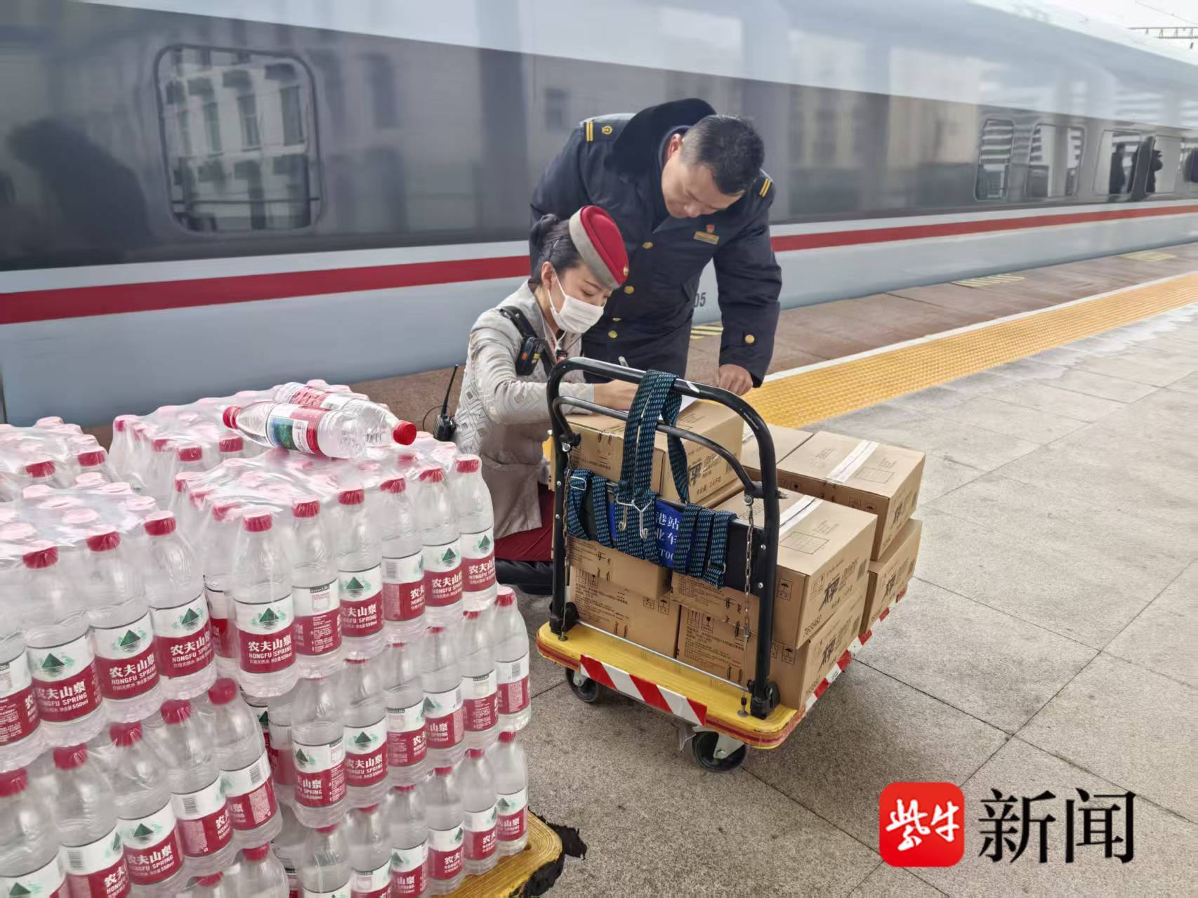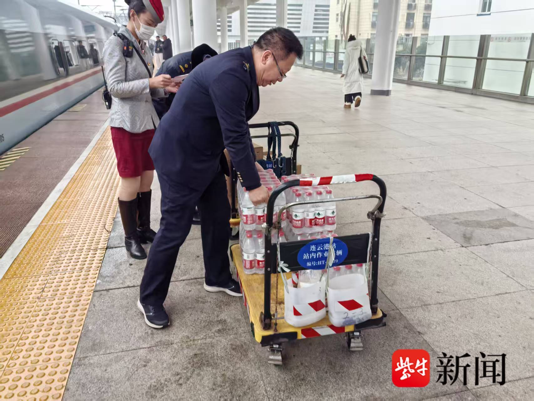 当日值班列车长向连云港站反馈该情况后,铁路连云港站副站长杨金刚迅速启用应急预案,带领站内客运值班站长许祥永协调华铁旅服准备快餐800份、矿泉水10箱份送上站台,等候列车到达。