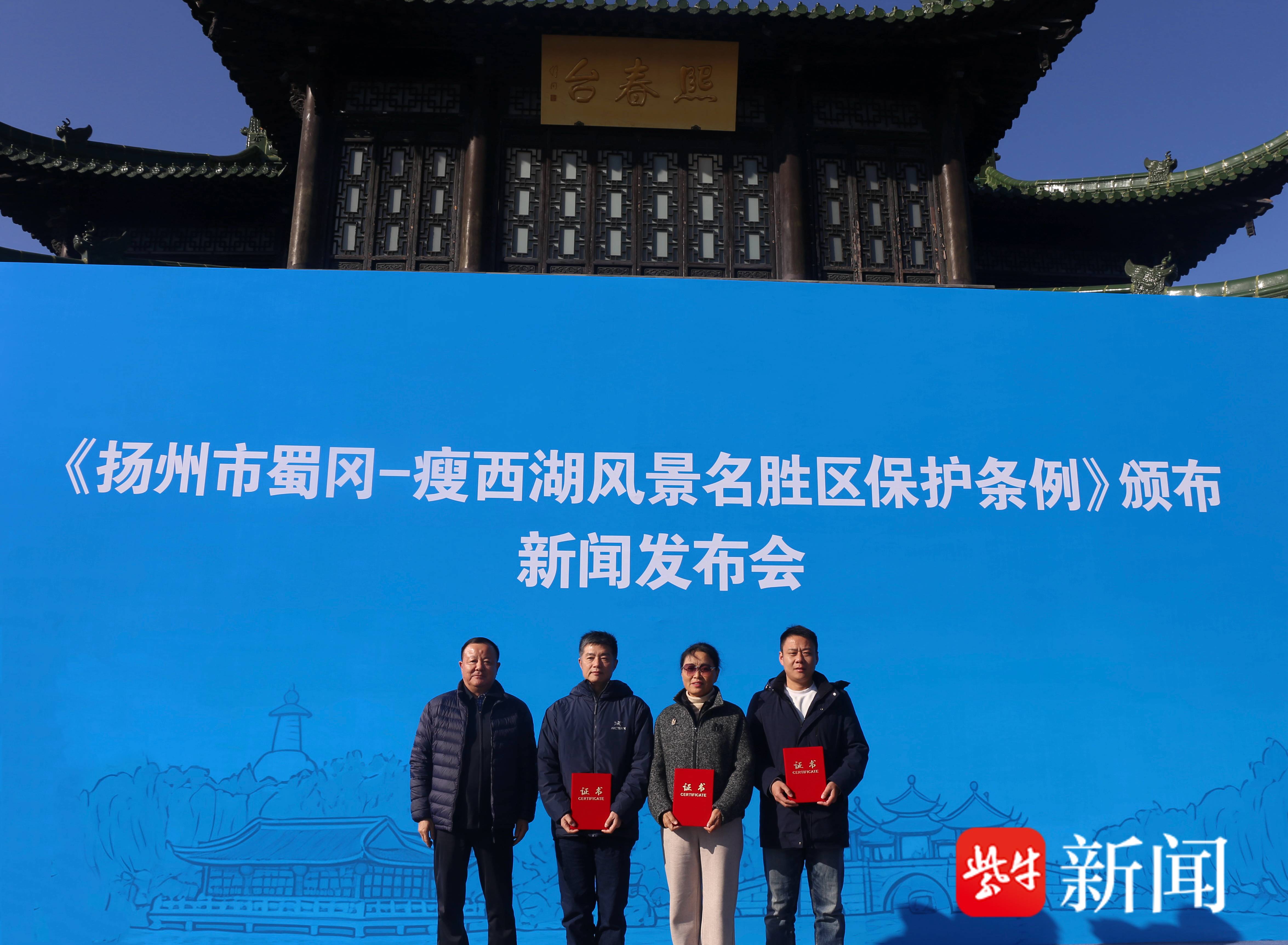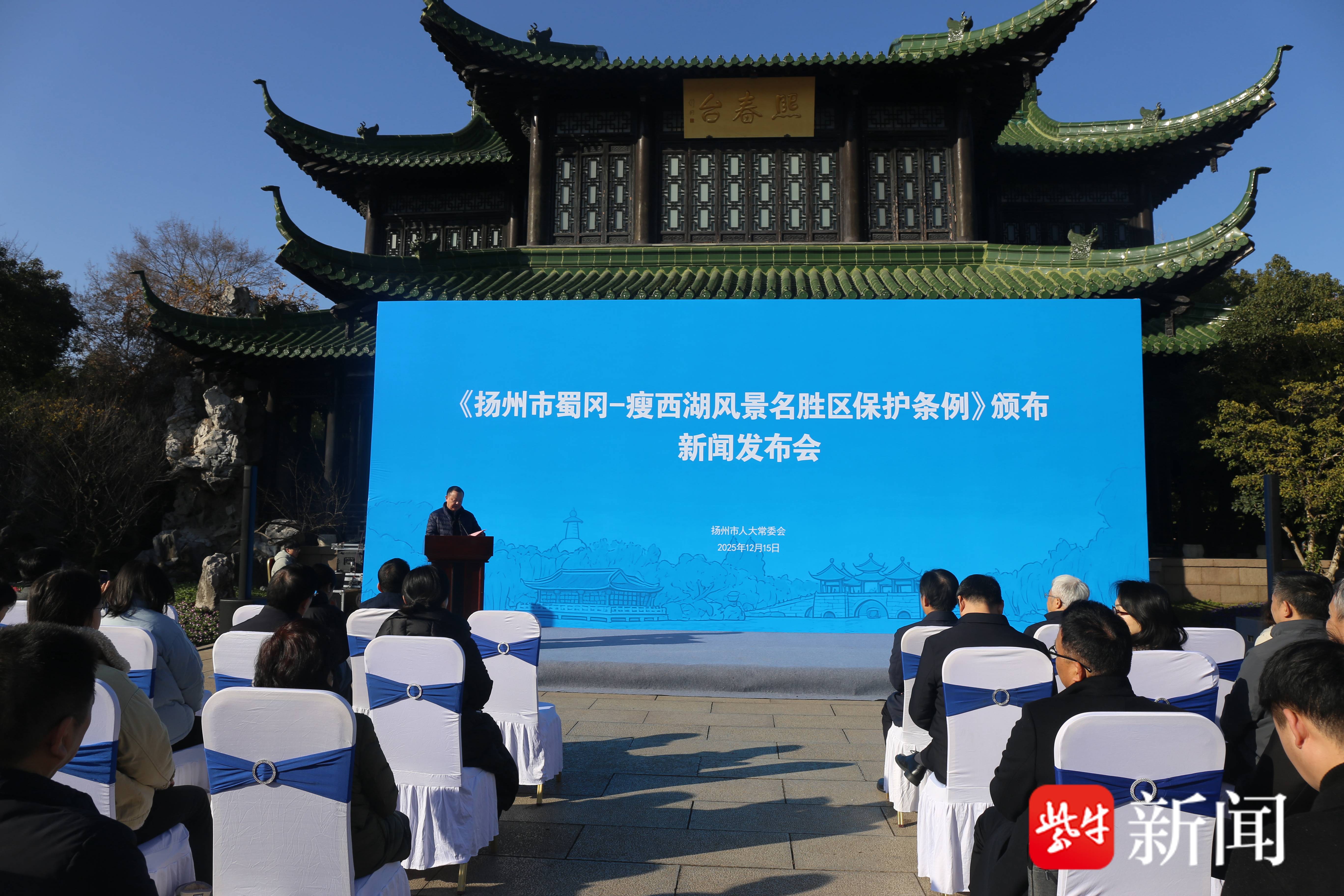 12月15日,《扬州市蜀冈-瘦西湖风景名胜区保护条例》(以下简称《条例》)颁布新闻发布会在瘦西湖公园熙春台举行。作为扬州历史文化保护法规体系的重要组成部分,这部承载着市民殷切期盼的地方性法规,历经严谨立法程序正式出台,将于2026年2月1日起施行,为这座国家重要历史文化名城的“城市第一名片”筑牢法治根基。