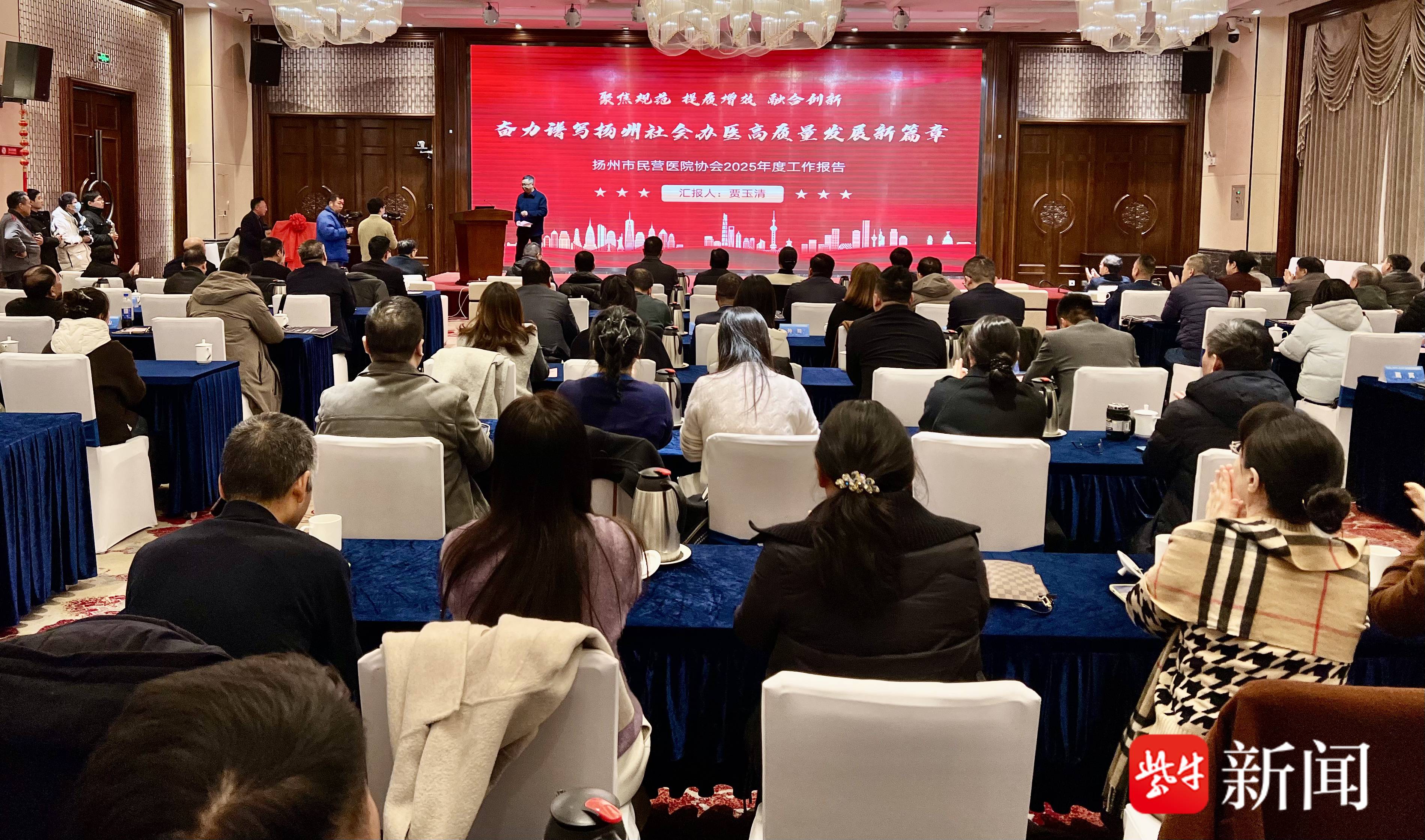 本次活动以“聚焦规范 提质增效 融合创新——共绘扬州社会办医高质量发展新蓝图”为主题。第一阶段由协会副会长,鼓楼集团仪征医院董事长、副书记钱晶主持。扬州市民营医院协会会长,扬州友好医院董事长、院长贾玉清作协会2025年度工作报告时说,2025年,协会引导会员单位走差异化、精细化、规范化发展之路。各会员医院依托京沪宁名院资源,打造优质医疗品牌:深耕心脑血管疾病治疗与脑促醒康复一体化领域;延伸妇产学科服务链,拓展产后康复、月子康养等特色服务;华创手外科、江都七里医院中医儿科形成一定优势;仪征、宝应等地医院聚焦老年医学、慢性病管理,探索医养结合新模式;曜阳、辅仁等康复医院构建专业康复网络;安美、绿康缘等护理院专注失能照护与安宁疗护,取得成效;眼科、口腔科等专科医院强化技术引进与温馨服务,树立良好口碑。