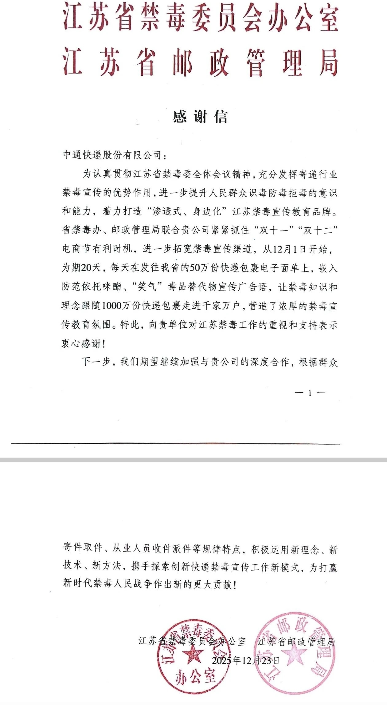 扬子晚报网12月26日讯(记者 徐兢)近日,中通快递江苏管理中心收到了一封特殊的感谢信,落款方是“江苏省禁毒委员会办公室“与“江苏省邮政管理局”。