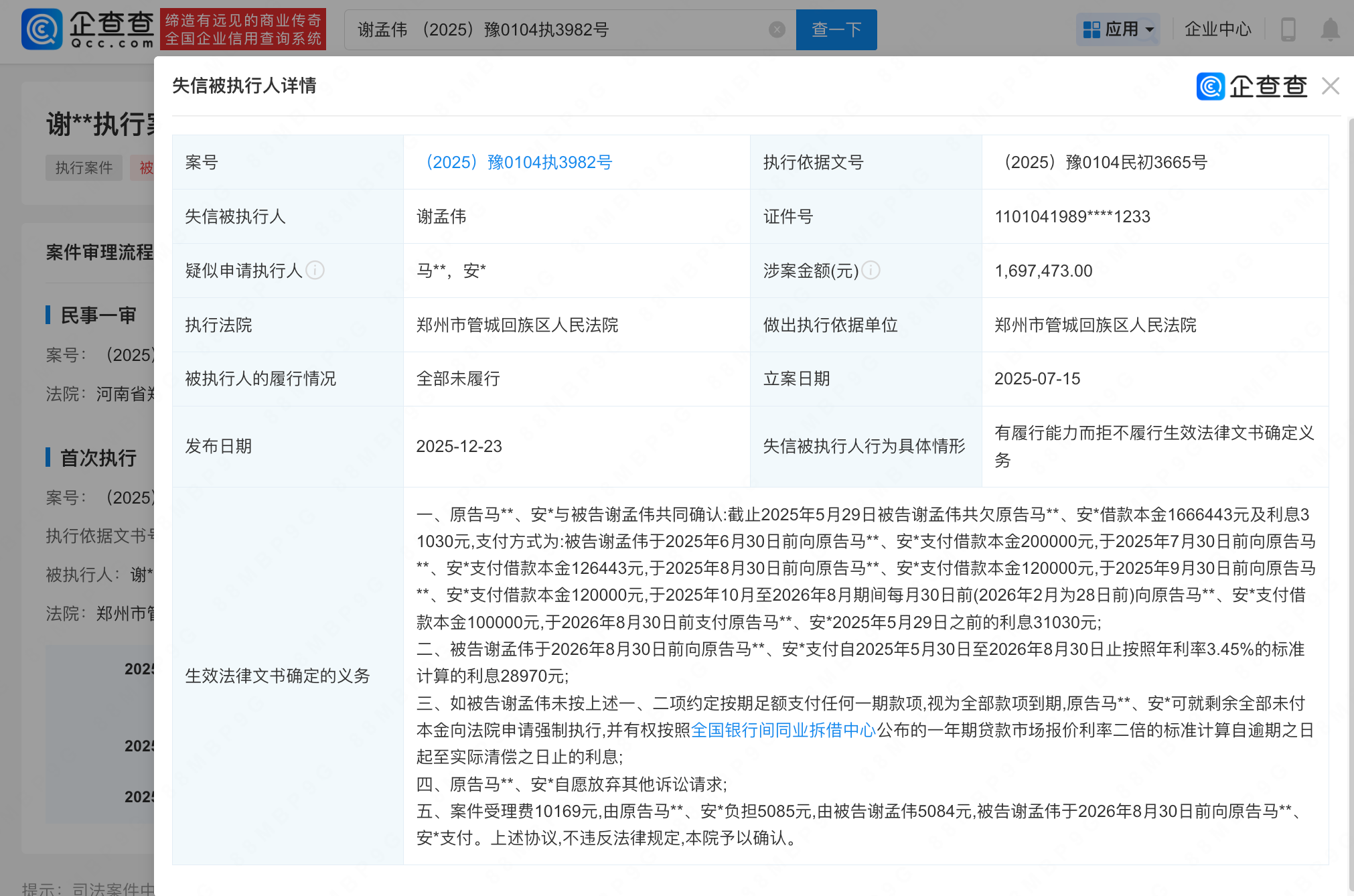 近日,扬子晚报/紫牛新闻记者从企查查获悉,“嘎子哥”谢孟伟因“有履行能力而拒不履行生效法律文书确定义务”被法院列为失信被执行人,涉及169万元民间借贷纠纷案件。