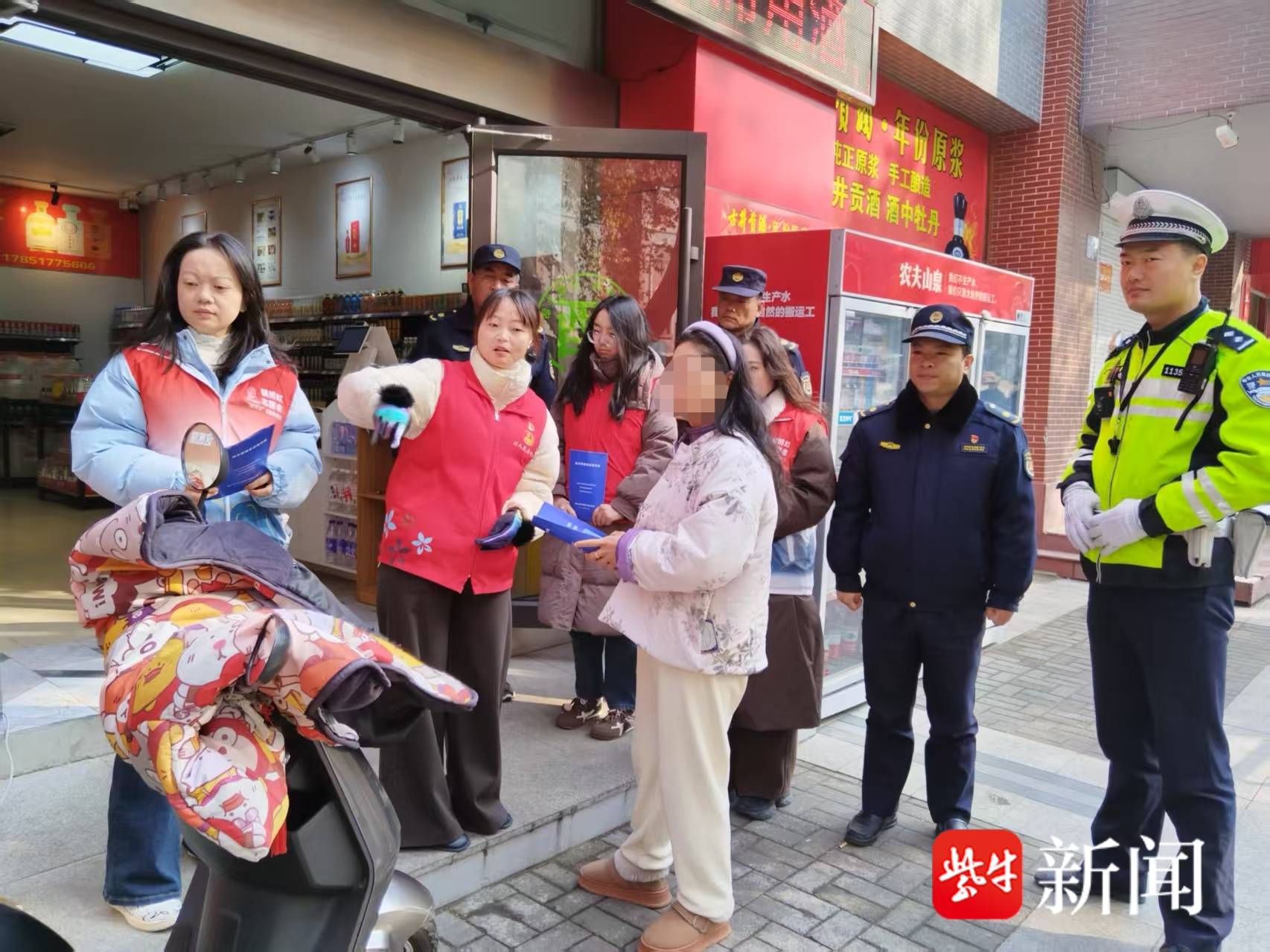 活动现场,“红马甲”志愿者成为一道醒目的风景。金山街道银山门社区志愿者巡查至一家药店门口时,发现有电动车不仅违规占用盲道,还存在私拉电线充电的现象,遂立即上前耐心劝导:“您好,麻烦把门口的电动车移到划线停车区,也请您提醒顾客规范停车,安全最重要。”店员听后积极配合,当场整改,及时排除了安全隐患。
