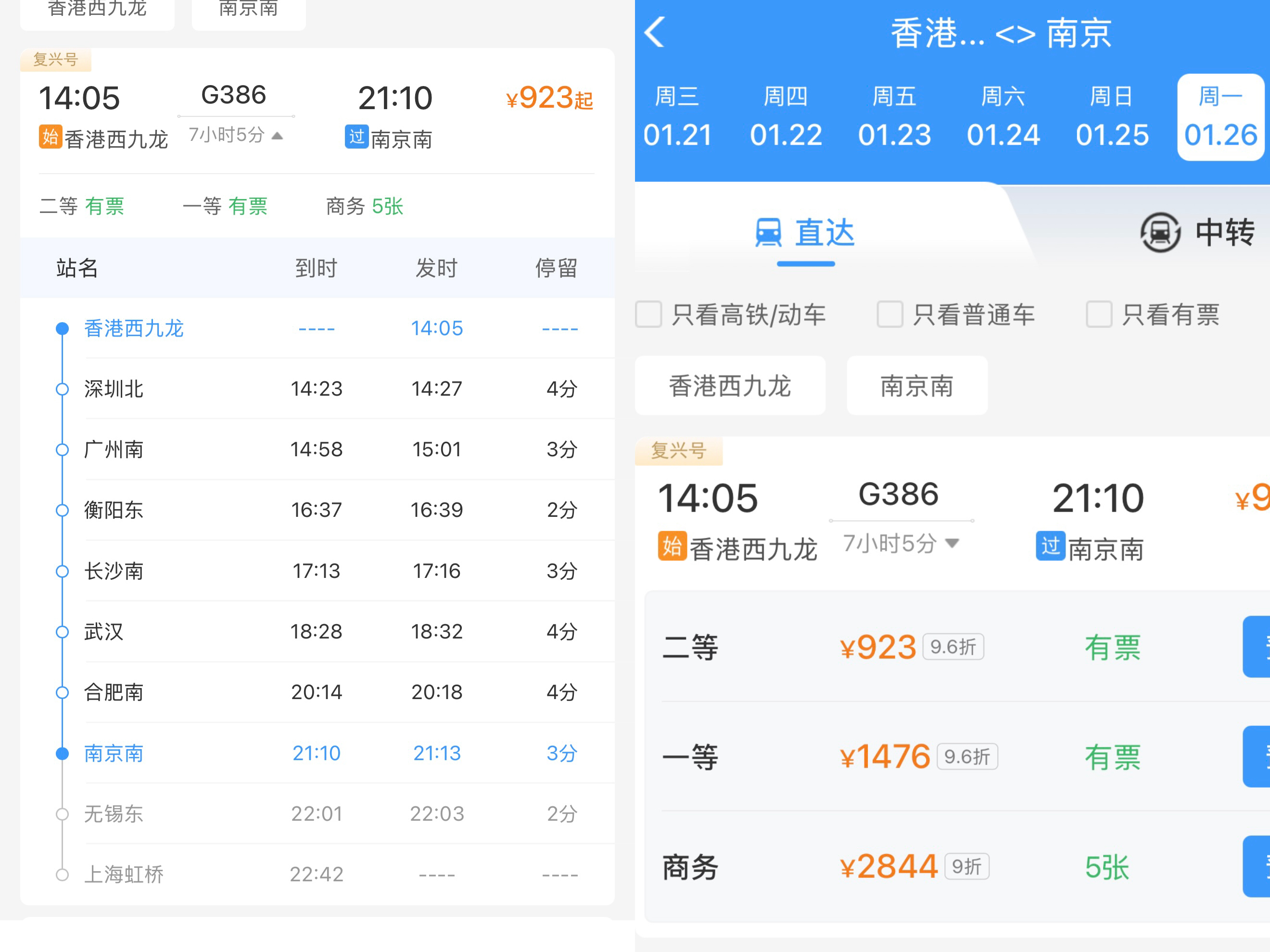 记者看到,这趟列车从香港西九龙站始发,前往上海虹桥站,除了南京南站,在江苏境内还将停靠无锡东站。到无锡东站耗时7小时56分钟,二等座票价95折后价格为1016元(原价1071元),一等座票价95折后1625元(原价1713元),商务座票价9折后3168元(原价3545元)。