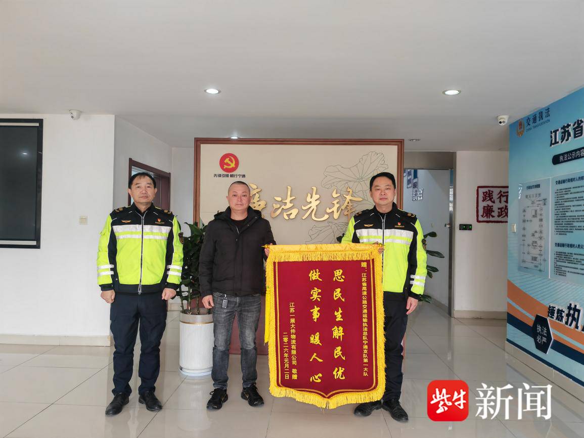扬子晚报网1月12日讯(通讯员 陆苏川 记者 成沫)近日,江苏省交通综合执法局宁通支队第一大队(以下简称“宁通支队第一大队”)收到了一份特别的“新年礼物”——南京港机重工制造有限公司相关负责人专程送来一面写有“思民生解民忧 做实事暖人心”的锦旗,以此感谢大队长期以来在保障企业大件运输畅通方面提供的精准、高效、贴心服务。