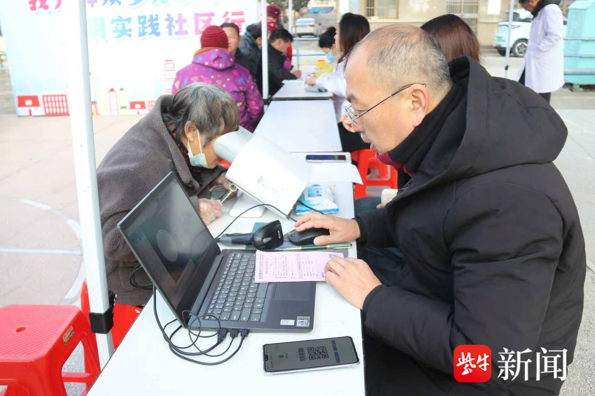在小区的活动广场上,多个服务区域有序划分,红、蓝、白三色身影忙碌穿梭。新洋卫生院的义诊区是最受欢迎的“打卡点”之一,医护人员一边为居民测量血压、血糖,一边详细记录健康数据,针对高血压、糖尿病等常见慢性病,给出个性化的饮食和用药建议。不远处的曙光爱尔眼科医院服务点,专家正逐一对居民进行视力检查、白内障筛查,还为大家科普日常护眼小技巧,不少老年居民特意带着老花镜前来咨询。