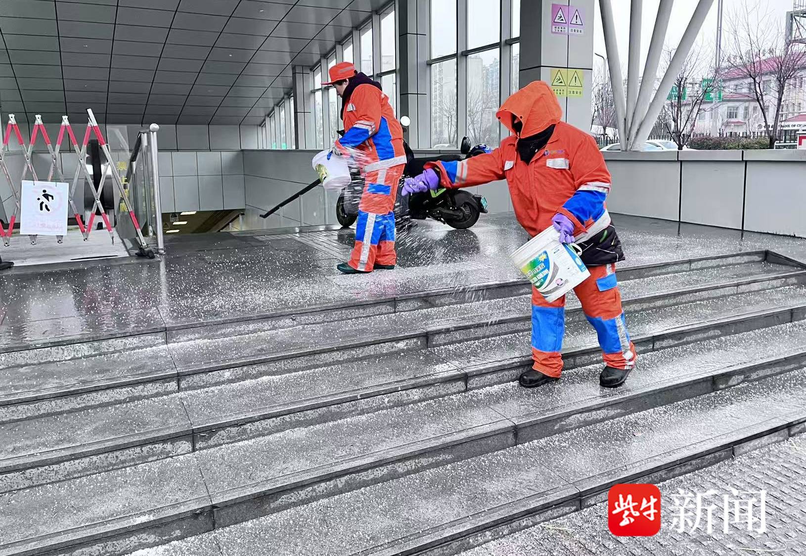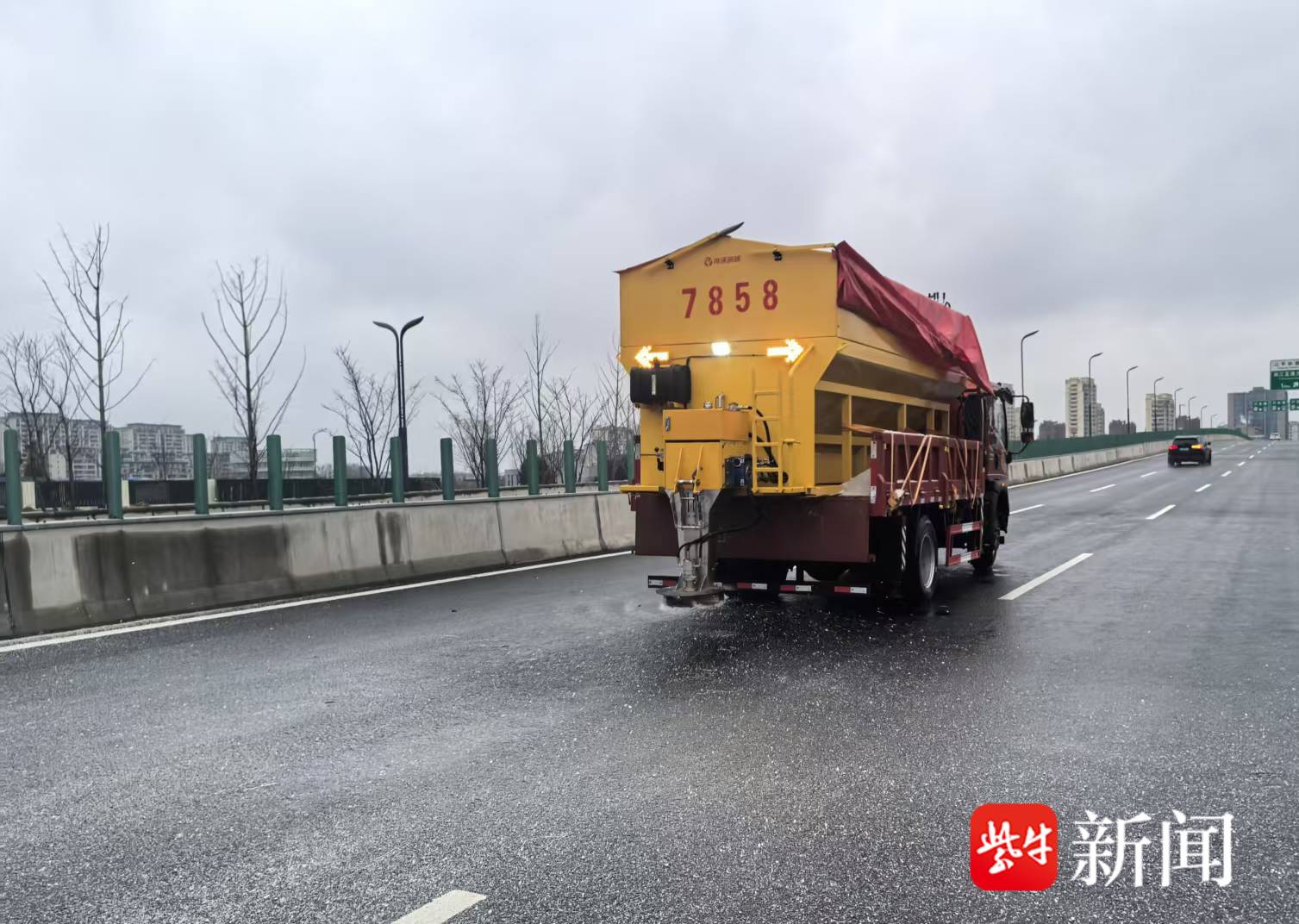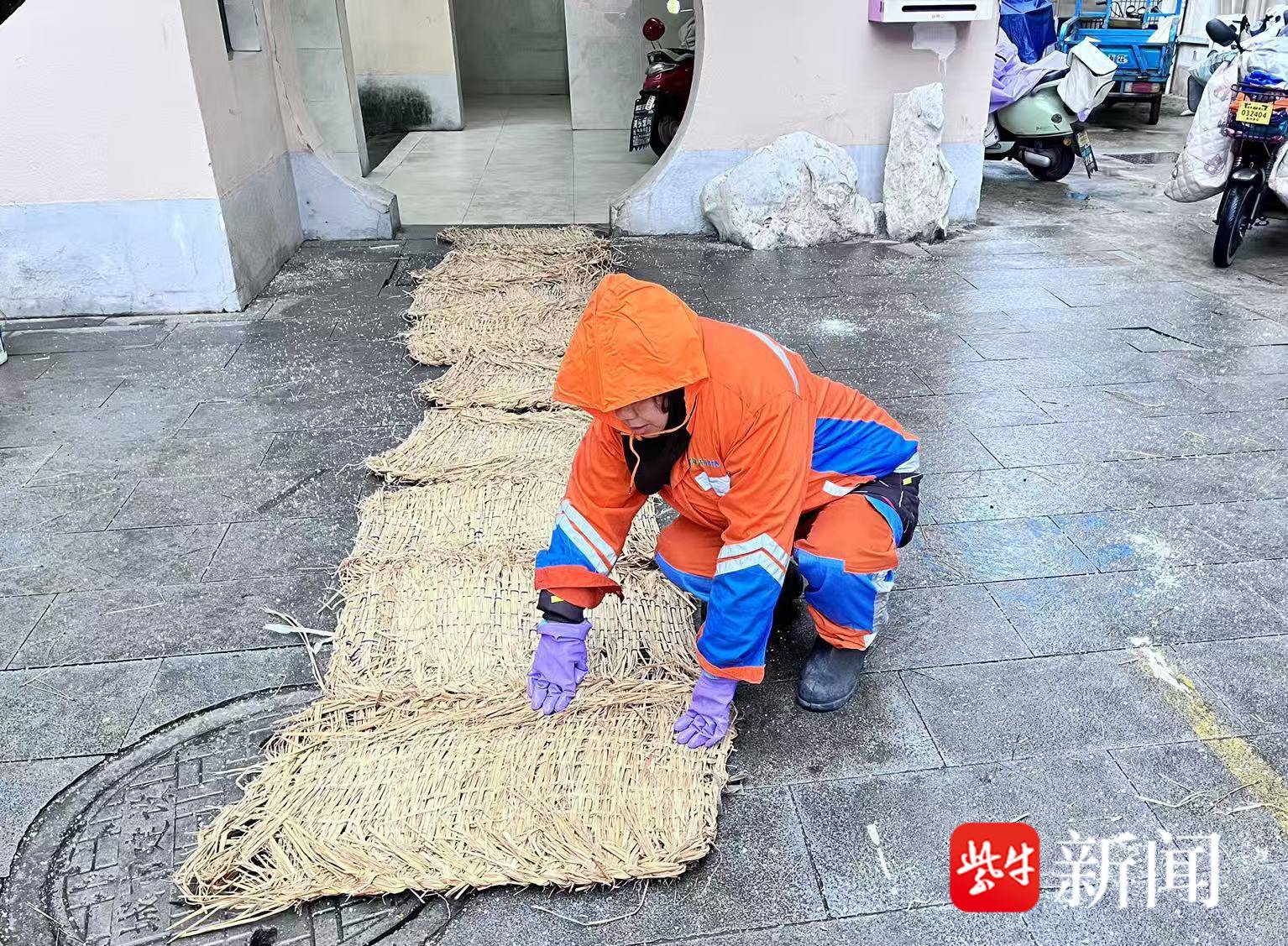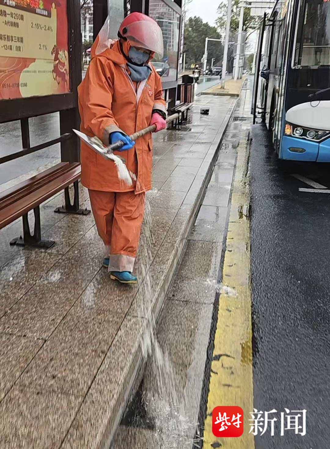 记者在润扬北路幸福魔方小区附近看到,海沃润扬的撒布机正在路上作业,将融雪剂撒布到匝道和高架桥上,防止路面结冰。江广快速路上,金宏宇物业的撒布机也在路上作业,向路面撒布融雪剂。扬子江中路天桥和公交站台附近,由于机械作业难以开展,环卫工人将融雪剂撒布到路面、台坡上,防止路面结冰。湾头镇迎宾路和玉器南街的公厕,环卫工人将草帘铺到地面,防止群众滑倒。