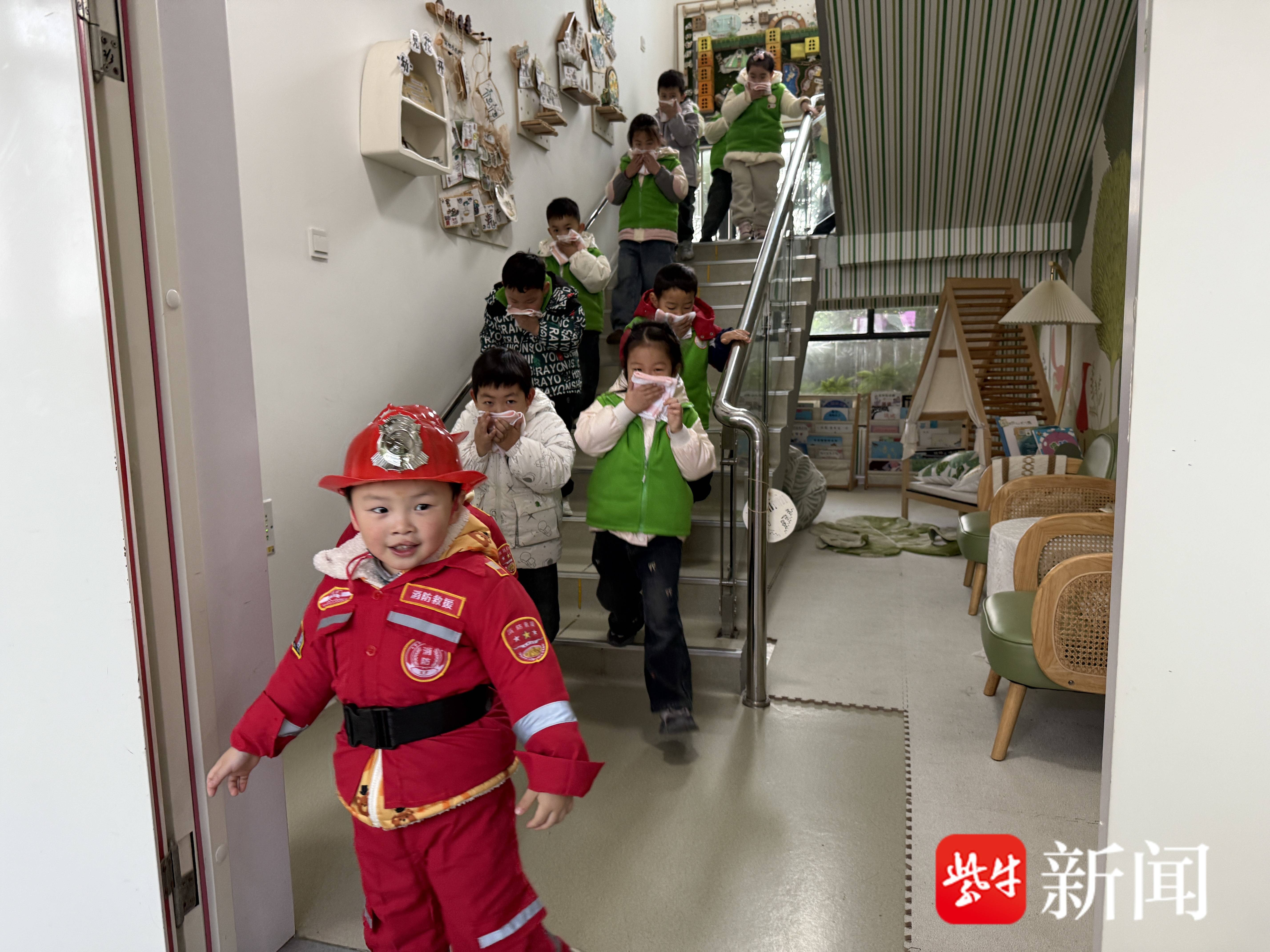 射阳县双拥路幼儿园则结合幼儿园场地特点,模拟火灾现场搭建起设有烟雾特效的障碍通道,开展“穿越火线”安全互动游戏。孩子们在“小小消防员”带领下弯腰低姿、手捂口鼻,快速且有序地穿越“浓烟危险区”。“着火的时候要弯腰捂鼻子!这个逃生游戏让我学会保护自己啦!”射阳县双拥路幼儿园幼儿张昭乐说。