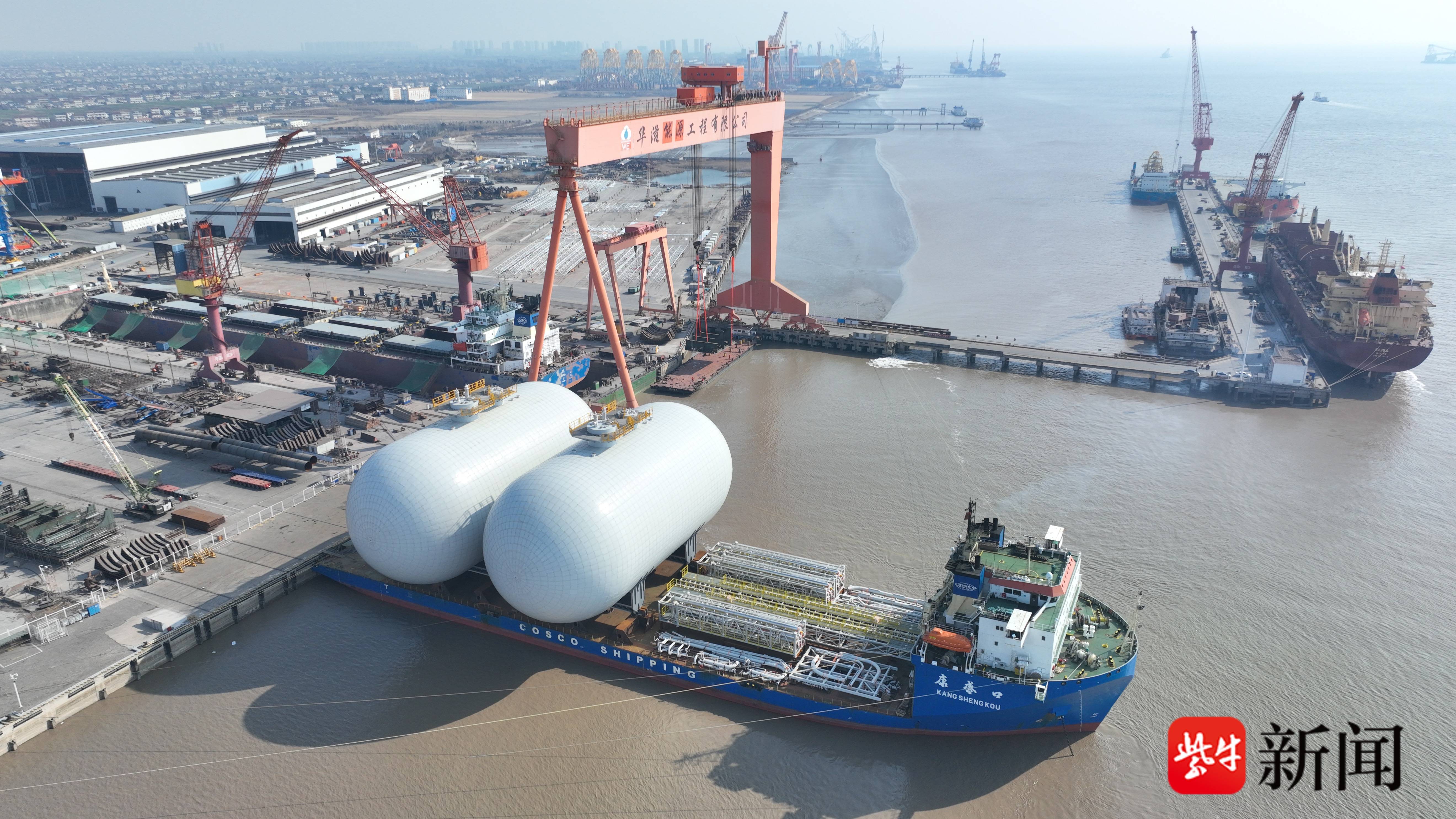 扬子晚报网1月23日讯 (通讯员 罗雪婷 张皓 记者 薛玲) 在南京海关所属启东海关监管与服务保障下,两座银白色的LPG(液化石油气)巨型储罐平稳完成滚装作业,1月22日从江苏启东搭载货轮启航,顺利发往海外。