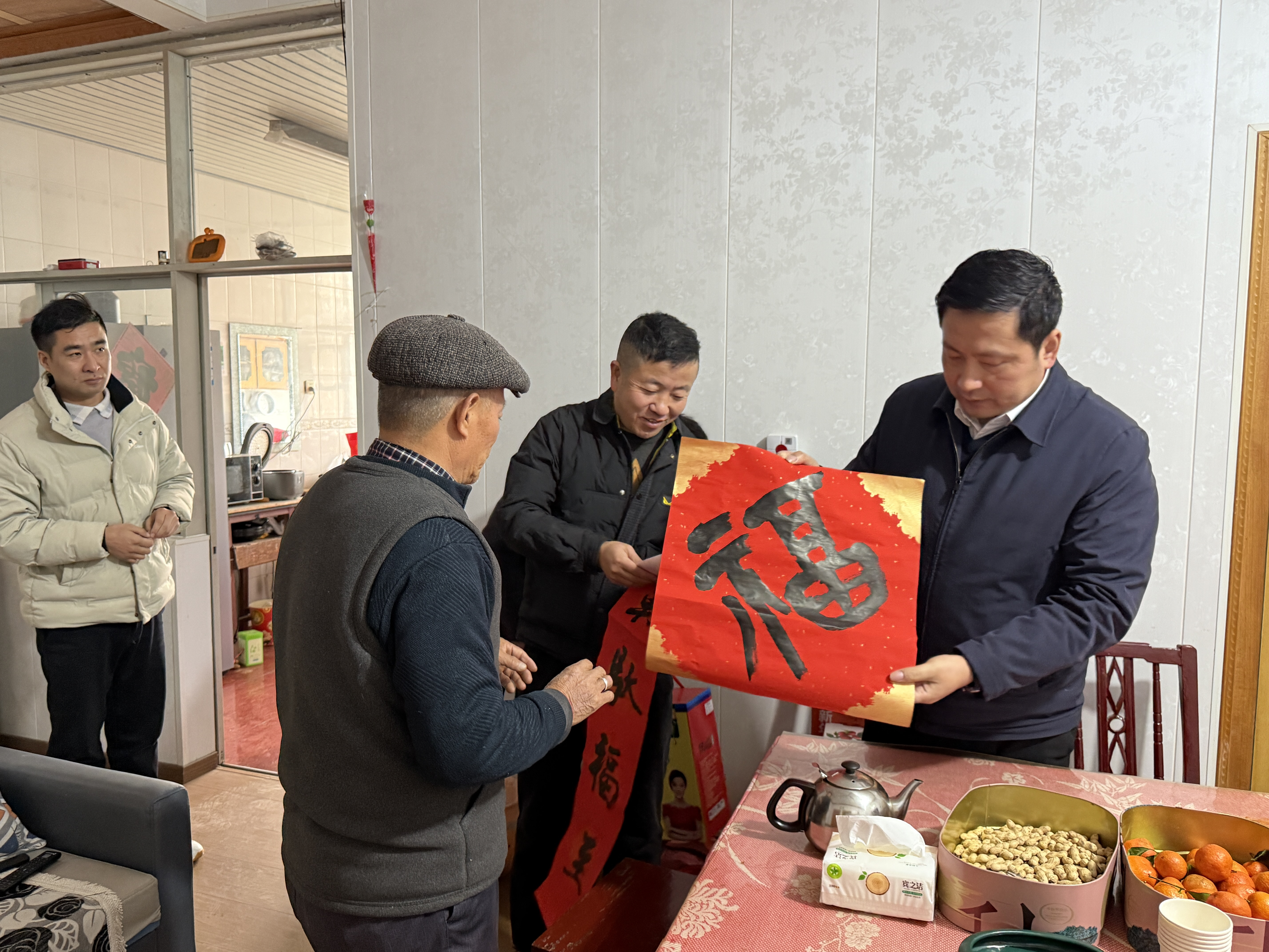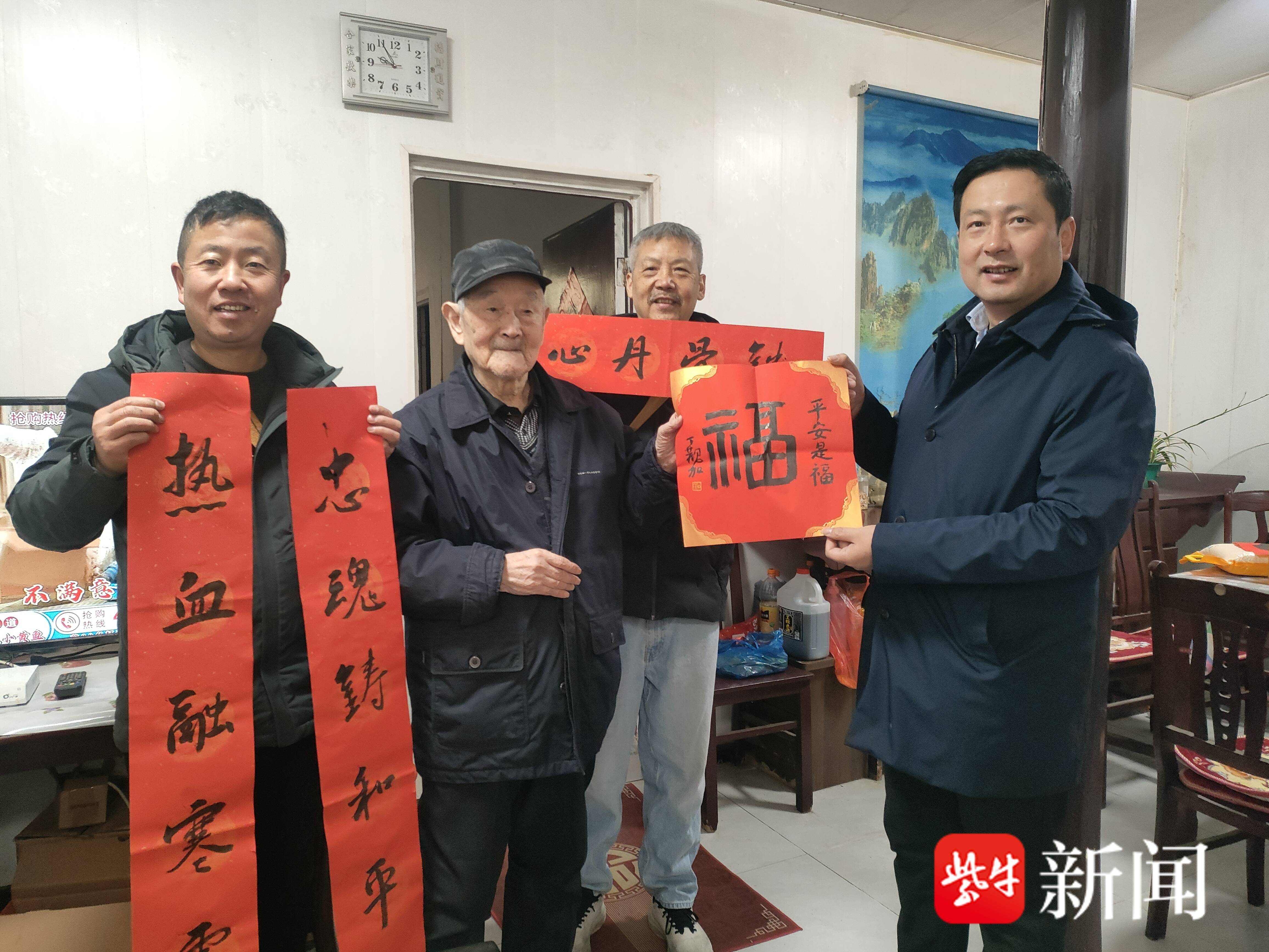 活动间隙,宝堰镇党委书记张彦来到现场慰问宝堰画院的书法家们,并且现场给村民们送刚写好的春联和福字。随后他又和宝堰画院赵金才院长一起带着刚刚写好的春联和丁观加老师写的福字,专程来到中大街81号抗美援朝老战士93岁的卞金本家中慰问,张彦书记祝卞老身体健康,马年春节快乐幸福。卞老手捧着福字,眼中闪动着泪花:“这福,暖心,感谢中国共产党!”