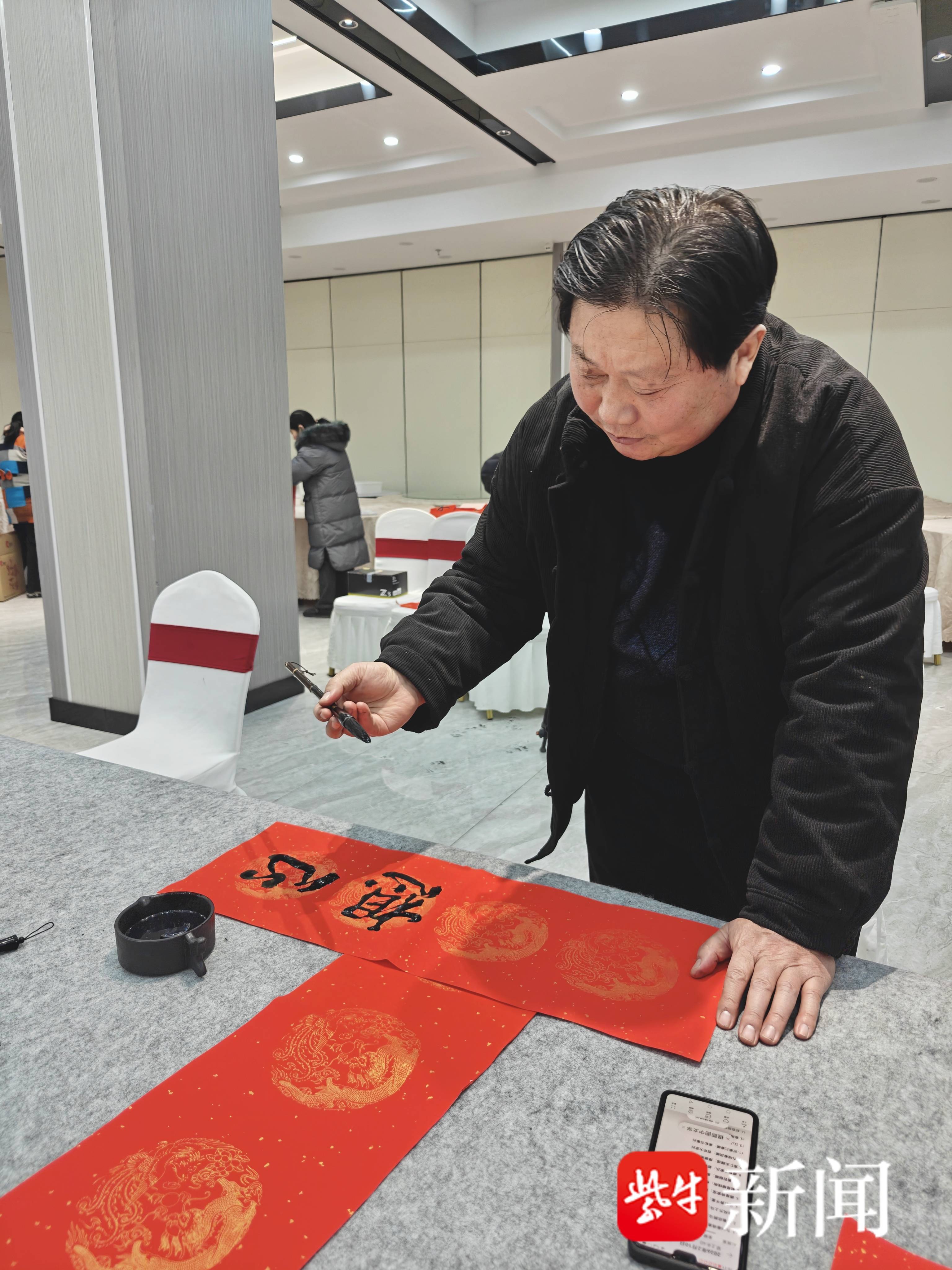 活动现场还邀请了多位知名书法家为困难家庭免费写春联、送“福”字。虞加军会长特别提到,此次活动还得到盐城市书法交流研究院院长吴月皓的倾情参与。“他平时一幅字卖得很贵,但是他今天写了这么多的字,一分钱都不要。”