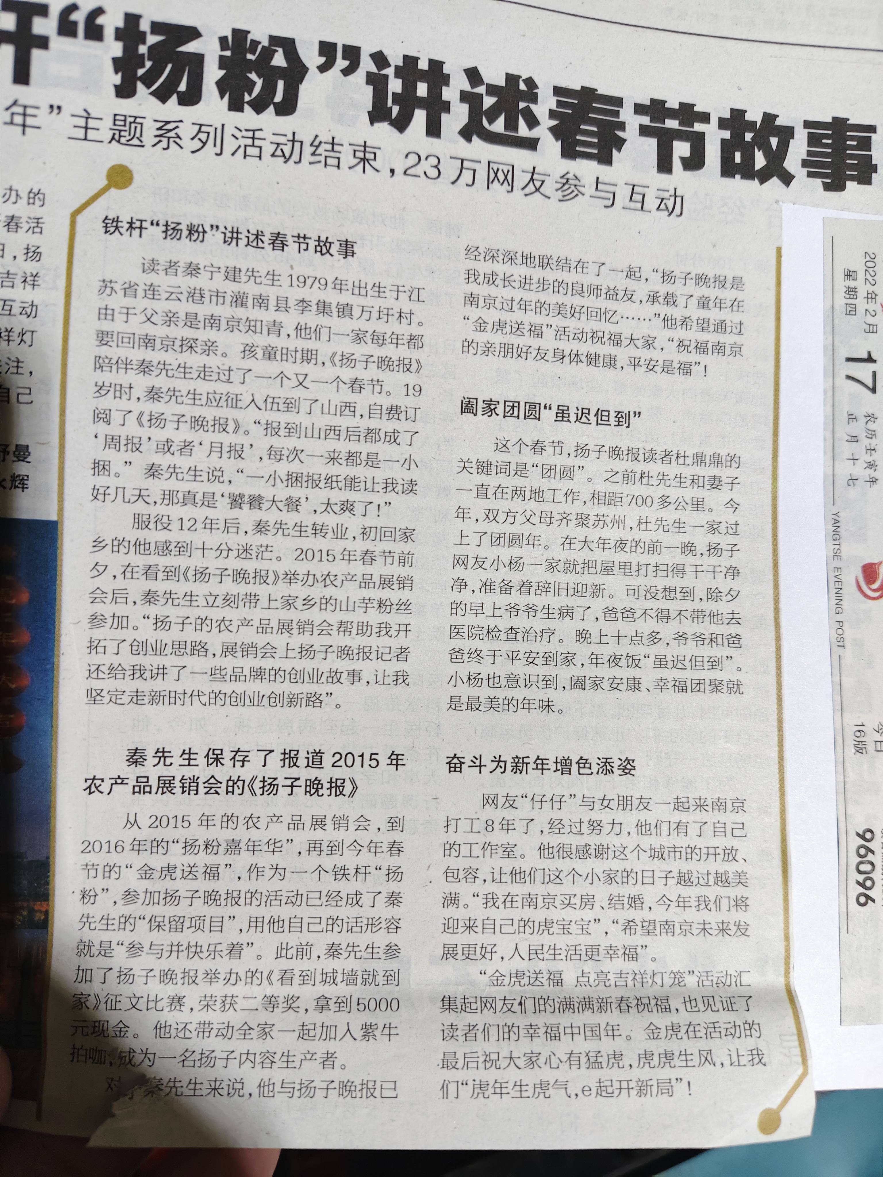 在部队开展的读报成才活动中,我首先想到的是订阅千里之外家乡的《扬子晚报》,军人的血性让我说干就干订阅《扬子晚报》跨越山水,历经千里《扬子晚报》到达山沟沟的军营已经成捆打卷,日报变成周报,月报,却让人乐此不疲,有报真好,家乡的味道真香。部队转业时根据政策我可以转业到南京离《扬子晚报》更近的地方工作,思前想后我毅然回到了父亲战斗过的地方苏北乡村奉献我的青春年华,待安置期间为了让我政治学习不脱轨,热爱灌南多一些,在国家电网工作的彪叔总会在下班的时候带点报纸供我翻阅,《扬子晚报》总是我搜寻的重点,阅读的核心,通过阅读《扬子晚报》我知道了家乡的大事小情,人间烟火,也知道了2015年《扬子晚报》农副产品展销会的举办,让我心动我终于有机会回报《扬子晚报》接近扬子人,准备充分我带着舅舅做的山芋粉丝到南京参展。要知道此前和父亲来南京,也带山芋粉丝去走亲访友,逛逛金陵城,看看南京人,请亲人品尝一下山芋粉丝“薯香浓香,口感纯正、入口顺滑”的特点,感受一下苏北人的淳朴与善良。参展临近,我带着山芋粉丝走物流,坐大巴通过肩扛手提到达指定地点,报名缴费,整理摊位,第一次面向南京市场,没有品牌没有经验,《扬子晚报》的主办方给我们想办法出主意起名字,“灌南粉丝”应运而生,当时的领导还有负责登记的小姐姐还说希望我们的灌南粉丝能够在《扬子晚报》的宣传推动下扬名天下,赢得市场,如今十多年过去了当时与扬子人的互动交流依然温暖着我,让我常怀感恩倍感温馨。