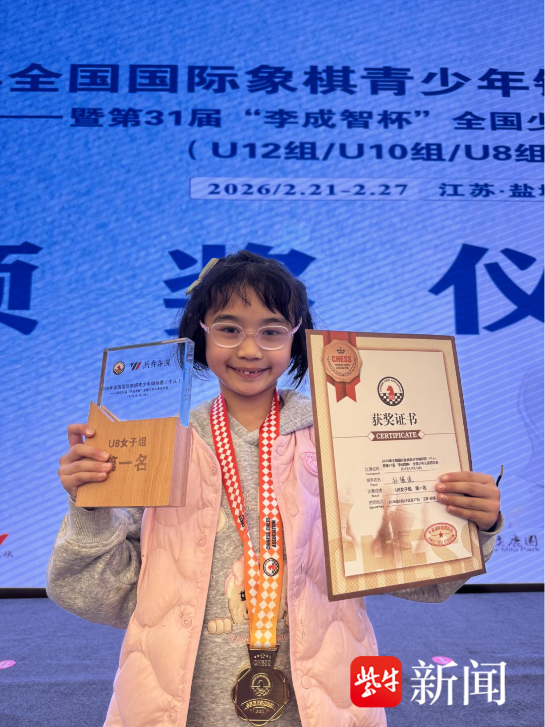 李成智杯全国国象赛落幕,镇江丹徒孙韫瑾不败战绩斩获 8 岁女子组桂冠
