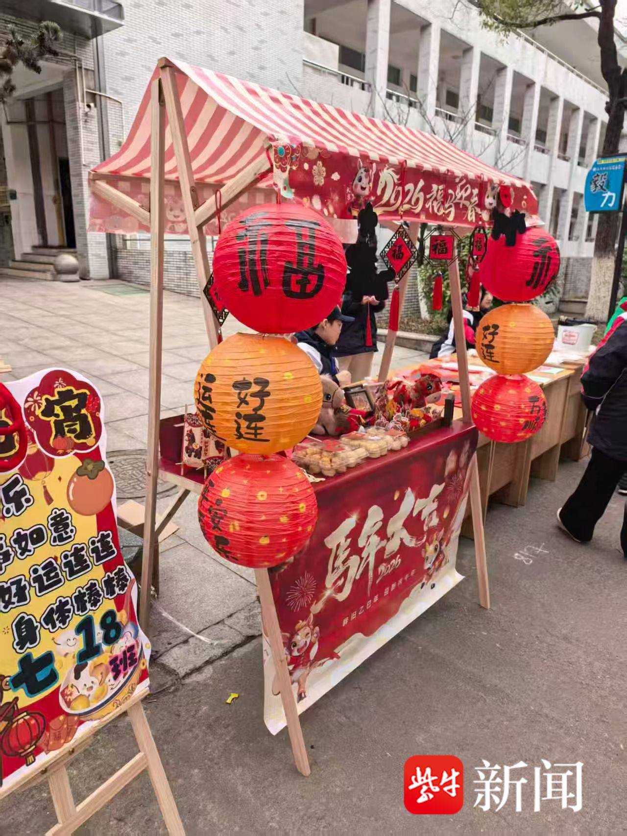 表演结束,非遗集市正式开张。尚礼楼、立美楼旁的南环路两侧,七年级36个班级的摊位一字排开,家长志愿者和同学们一起动手,把摊位装扮得年味十足。马年剪纸惟妙惟肖,生肖窗花红韵喜人,粘土小马憨态可掬,还有拓印、糖画、中国结……每一件手作都透着孩子们的巧思。