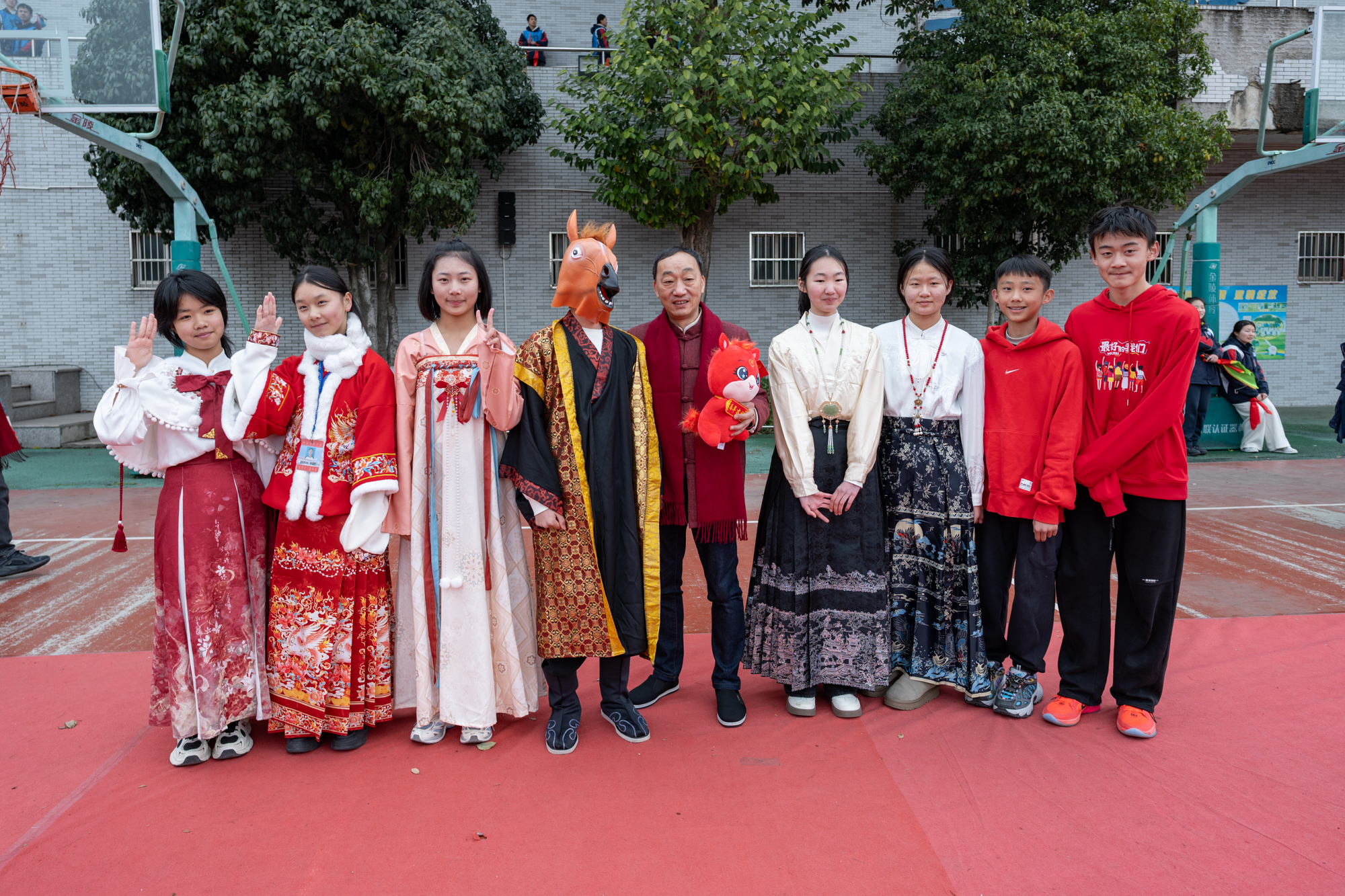 “快看,那个戴马头面具的太酷了!”下午2点,伴随着欢呼声,一场华裳走秀拉开了活动序幕。同学们有的身穿飘逸汉服,有的身着喜庆红装,手持马行花灯,佩戴马年元素饰品,踏着古风音乐款款走来,一步一姿尽显华夏礼仪之美。