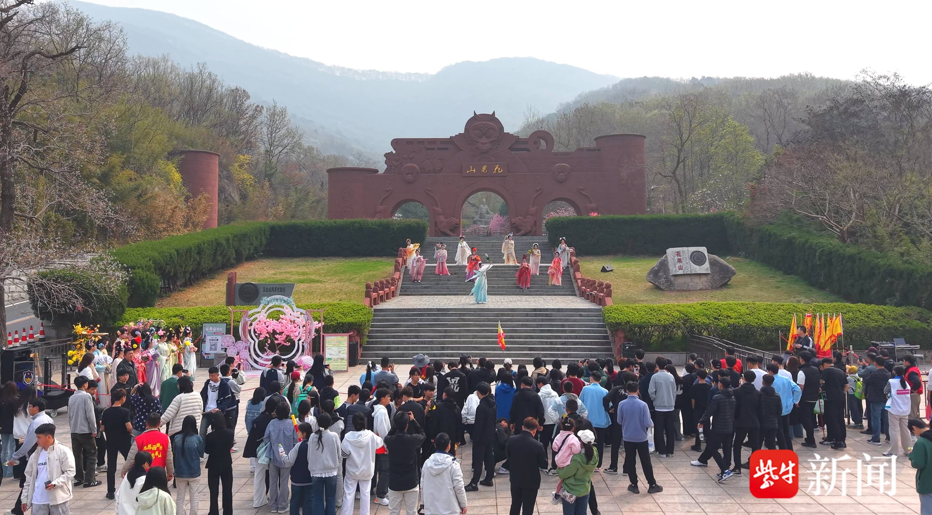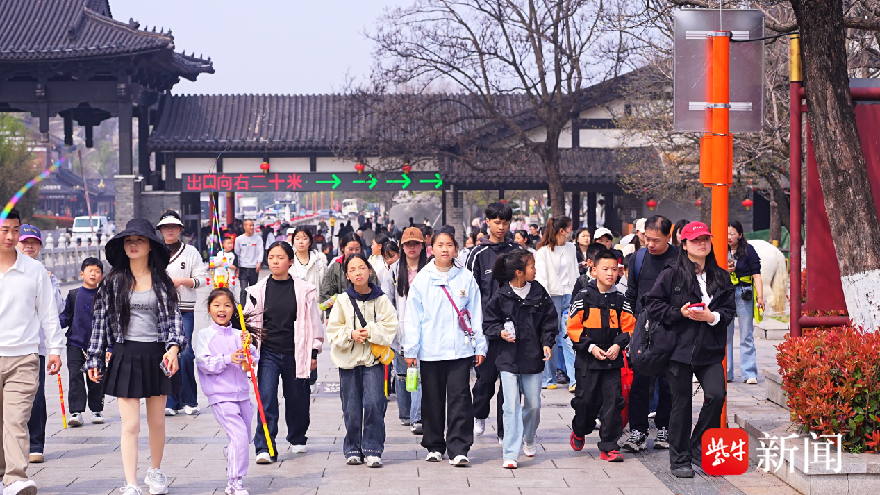 4月2日早上9点不到,花果山脚下已人头攒动。9岁的赵子文小朋友背着书包一路小跑,不是去上课,而是赶赴一场与春天的约会。刚进山门,头戴簪花的“花神”NPC含笑相迎,递上一枝海棠花。小姑娘愣了一下,随即咧开嘴笑了,拉着妈妈的手钻进熙熙攘攘的人群。春和景明,正是出游好时节,与往年清明假期不同的是,花果山游客中多了许多“大手牵小手”的身影。