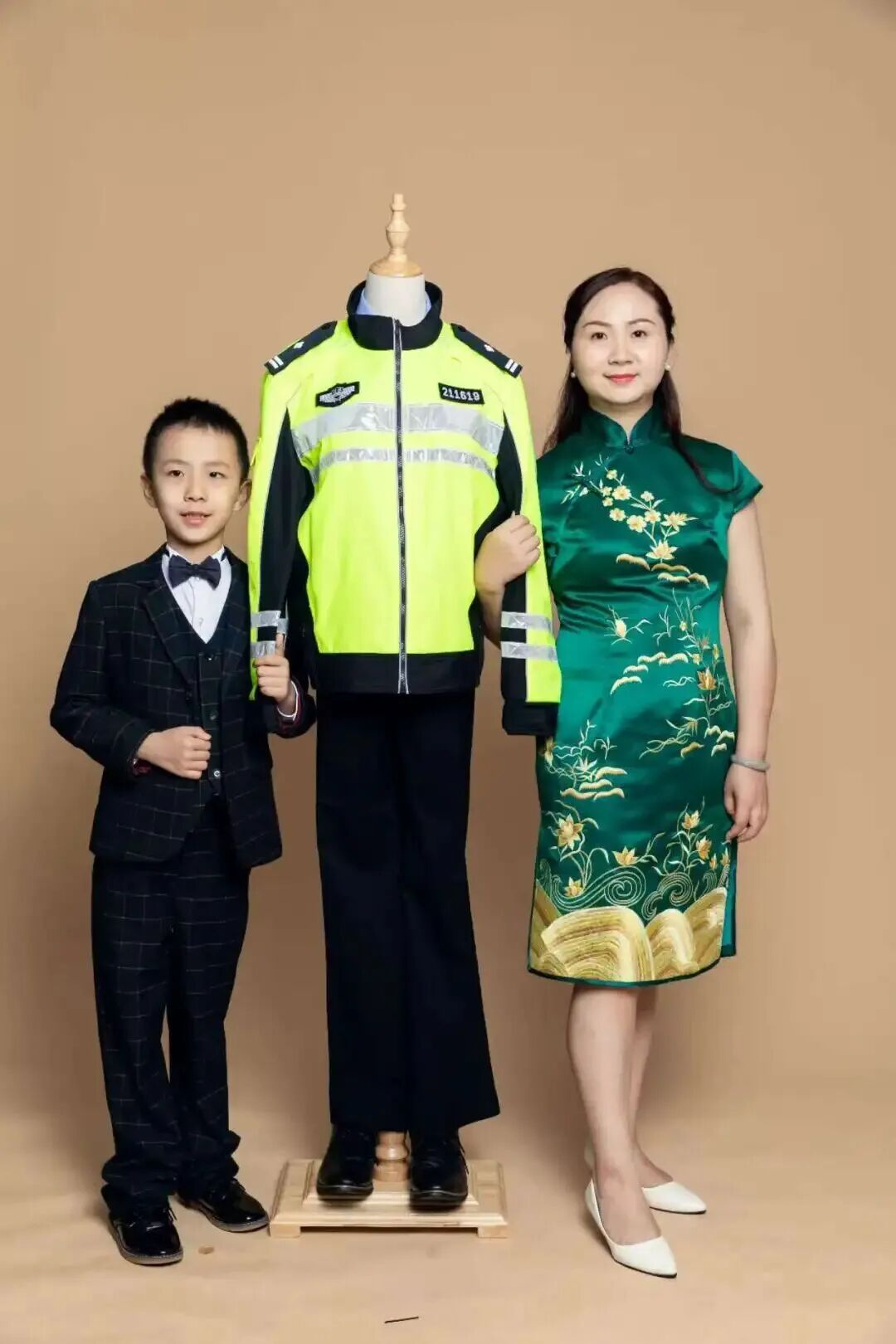 史伟年曾跟王婕约定,儿子十周岁去照相馆拍全家福。云帆十周岁那天,第一次穿上西装,妈妈穿上久违的旗袍。那是一张特殊的全家福,母子俩的微笑货真价实,衣架撑起的警服在那一刻仿佛英雄神采奕奕“归来”。