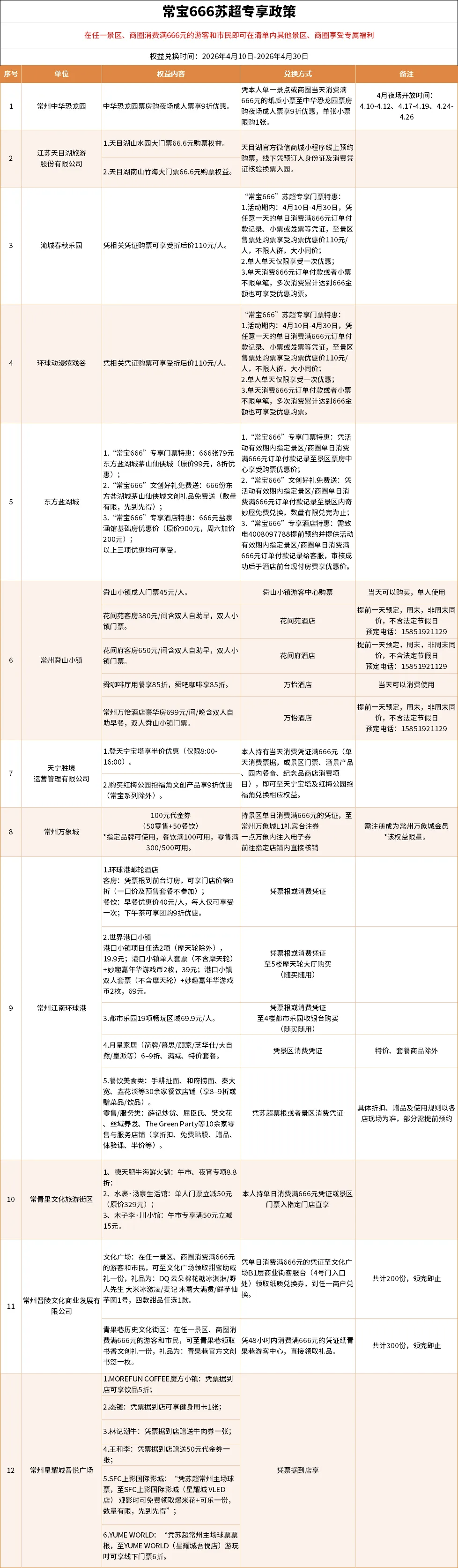 4月10日至30日,凡在中华恐龙园、天目湖、春秋淹城、环球动漫嬉戏谷、东方盐湖城、舜山小镇、天宁寺、红梅公园、万象城、江南环球港、文化广场、青果巷、常青里、星耀城等任一常州重点景区或商圈消费满666元,凭消费小票即可在其余13个景区商圈享受专属优惠。这意味着,一张小票便可串联起游园、购物、美食、观景等多重体验,真正实现“花出666倍的快乐”。