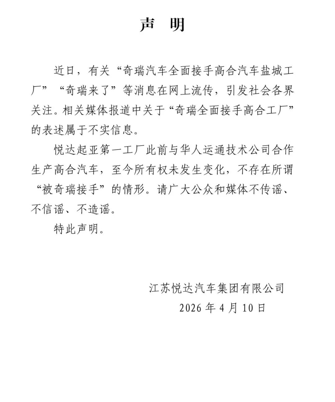 声明指出:“相关媒体报道中关于‘奇瑞全面接手高合工厂’的表述属于不实信息。”声明强调,悦达起亚第一工厂(即原高合汽车盐城工厂)此前与华人运通技术公司合作生产高合汽车,至今所有权未发生变化,不存在所谓‘被奇瑞接手’的情形。悦达集团在声明中呼吁广大公众和媒体“不传谣、不信谣、不造谣”。