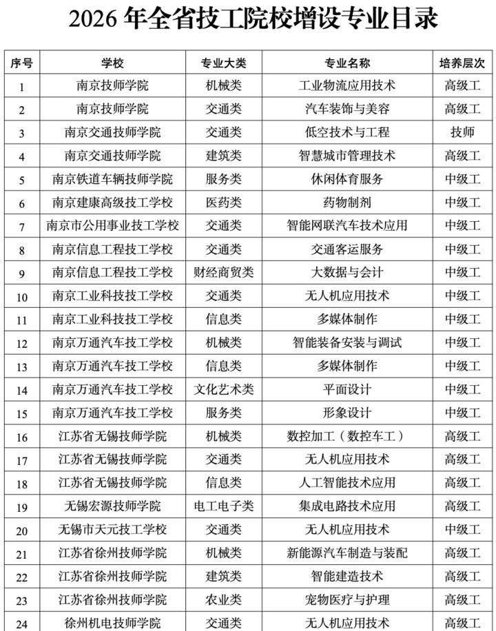 江苏技工院校新增157个专业(附专业目录)
